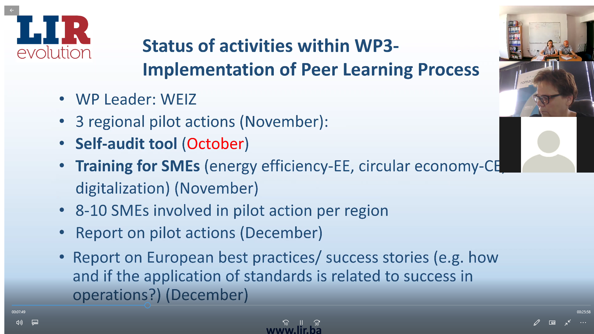 WP3 is led by WEIZ, while RT and LIR were involved in all activities in WP. WP3 resulted in effective peer learning process. Partners conducted regional situation analysis on adoption of EU standards by SMEs. Partners organized meetings with SMEs to analyze best practices and exchange knowledge. Partners implemented 3 pilot actions involving local SMEs, one per project region. Pilot actions focused on consultations with SMEs and development of practical self-audit tool in energy efficiency, circular economy and digitalization. Within pilot actions, partners delivered trainings tailored to needs of regional SMEs. Insights gained from regional situation analysis, pilot actions and research on third party solutions were used in development of DOP.