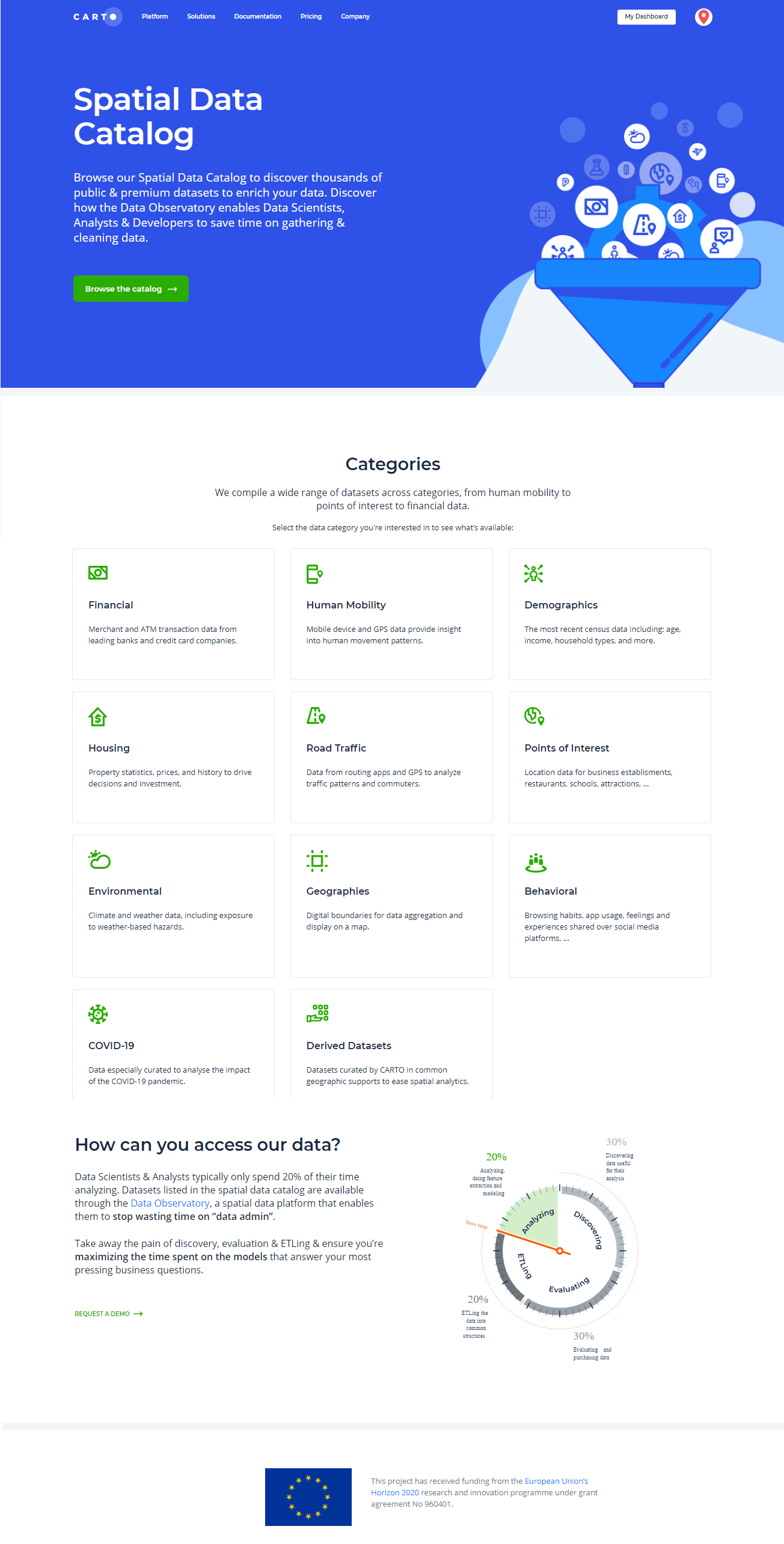 This requires harmonizing data from many providers using Machine Learning and building a common Index. We are looking at reducing the time it takes for a user to make use of a location dataset from 1 month to just a few hours. With NextGen.DO CARTO will change the way location data is accessed, paid, and used, and will result in substantial growth of CARTO’s market penetration.