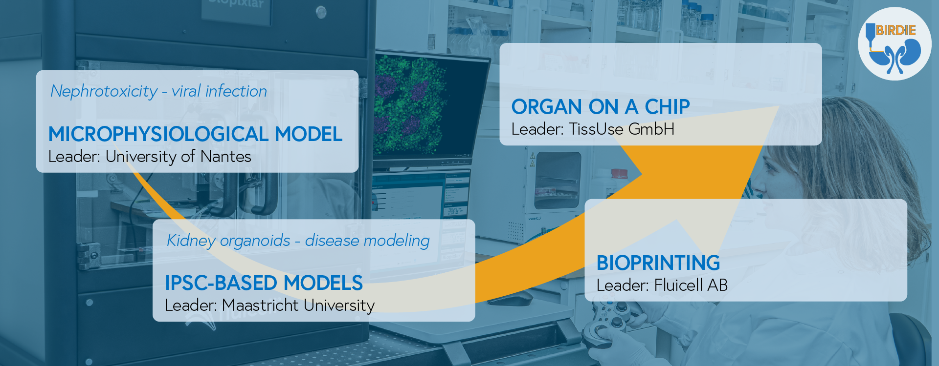 * Develop and implement the dual organ-chip-model to investigate BKPyV infection and drug induced AKI. We will use a TissUse (TU, high-tech SME partner of BIRDIE) proprietary dual organ-on-chip (HUMIMIC chip) to better mimic the complexity of the renal environment by including stromal (i.e. fibroblasts) and immune cells (i.e. myeloid dendritic cells), which are thought to participate to early pathophysiology of the BKPyV infection. A “personalized” version of the model will be aimed by applying iPSCs-derived renal progenitor cells;