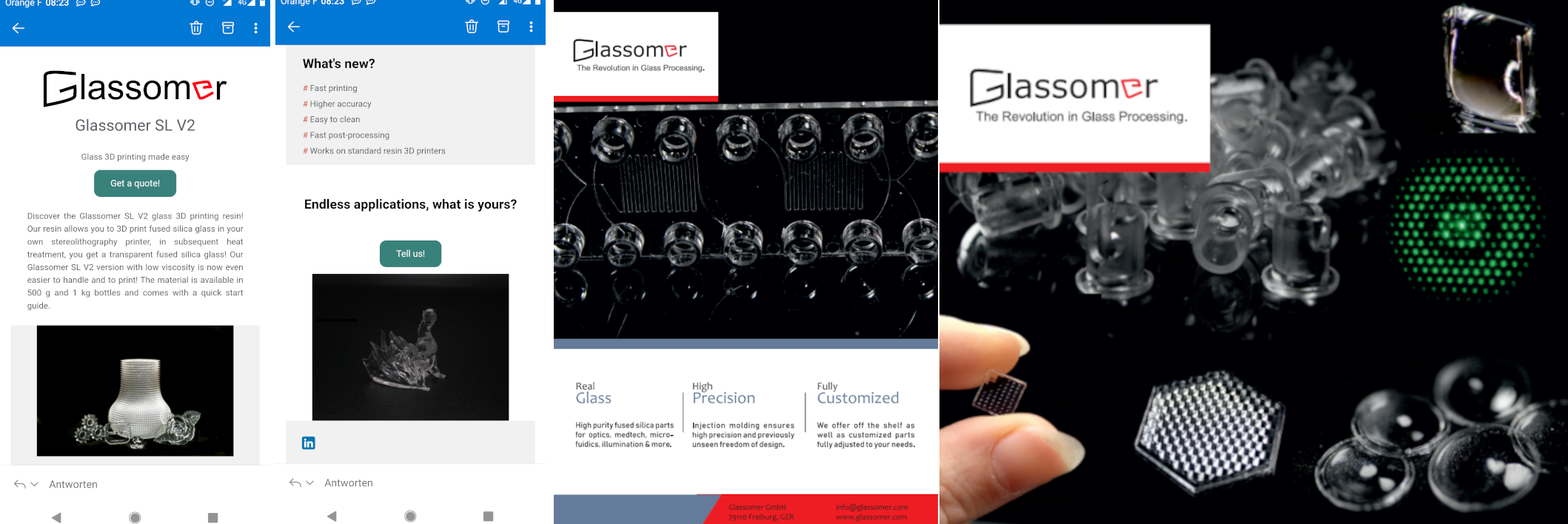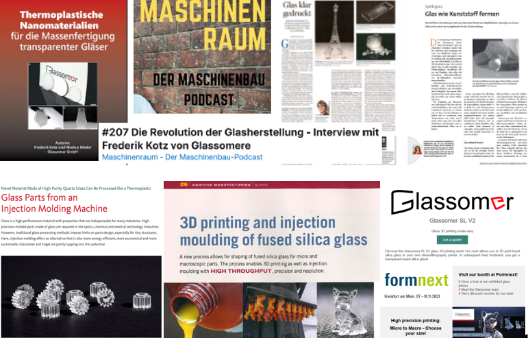 For effective dissemination, Glassomer has launched a new homepage as part of the PR strategy, which (along with its makers, tp werbeagentur) has won the International Creative Media Award (ICMA) of Excellence. Glassomer regularly joins major international trade fairs like Photonics West and has taken part in numerous discussions relating to the future of the glass industry in times of energy shortage and high costs (see Figure 4). For customer information and attention, a regular newsletter was set up for customers and several supporting conference materials were designed (see Figure 5). Glassomer was featured in several media outlets: The VDI, podcast “Druckwelle” of ingenieur.de Nachrichten aus der Chemie, podcast “Maschinen Raum” conducted an interview with co-founder Dr. Frederik Kotz-Helmer, Articles were published in Mikrofertigung and Kunststoffe.de (see Figure 6). Co-Founders Rapp and Kotz-Helmer also edited the book “Additive manufacturing of glass” with contributions of major glass scientists around the world, highlighting the impact of the Glassomer Technology for on-demand manufacturing.