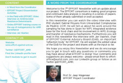 Moreover, the newsletter provides : - a link to the video interview of PhD Student Gabriel Moyano giving an update about the sampling he has done in Spain. - the opportunity to register for the coming EFFORT training course and workshop entitled metagenomics applied to surveillance of pathogens and antimicrobial resistance at the following link: http://www.effort-against-amr.eu/page/mg-workshop-online-registration.php(se abrirá en una nueva ventana) - an interview with Jan Vaarten, Chair of the EFFORT External Advisory Board. To view the newsletter, please click on the following link at: http://www.effort-against-amr.eu/page/publications/downloads.php(se abrirá en una nueva ventana)