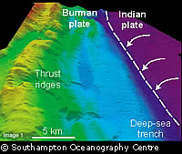 Durch die Forschungsarbeit des Zentrums für Ozeanografie in Southampton (Southampton Oceanography Centre) und die Studie 'British Geological Survey' ist es gelungen, die ersten Bilder vom Meeresboden im Epizentrum des Seebebens zu erhalten, das den zerstörerischen Tsunami im Indischen Ozean ausgelöst hat. Die Bilder des Meeresbodens wurden von der HMS Scott, einem Forschungsschiff der britischen Royal Navy, mit einem hochauflösenden Mehrstrahlsonar aufgenommen. Es ist das erste Mal, dass der Meeresboden so kurz nach einem Erdbeben der Stärke 9 auf der Richterskala vermessen wurde. Die Ergebnisse der Studie waren aufschlussreicher, als die Wissenschaftler zunächst gehofft hatten. Die Aufnahmen zeigen deutlich, dass die indische Kontinentalplatte in einer Tiefe von rund 40 Kilometern mit der burmesischen Platte kollidiert ist. Das Southampton Oceanography Centre (SOC) erklärte: 'Dieser Zusammenprall hat dazu geführt, dass die indische Platte unter die burmesische Platte gedrückt wurde. Die plötzliche Bewegung dieser beiden Platten hat das verheerende Seebeben und den Tsunami ausgelöst.' Farbige Höhenlinienkarten des Epizentrums zeigen, wie durch den Zusammenprall spektakuläre Bergkämme mit einer Höhe von bis zu 1.500 Metern aufgetürmt wurden. Zu erkennen sind auch Bereiche, in denen diese instabilen Gesteinsmassen riesige Erdrutsche verursacht haben. Diese ersten Ergebnisse sollen die Grundlage für weitere Studien des Erdbebengebiets im Rahmen einer internationalen Kooperation bilden. Lisa McNeill vom SOC erklärte: 'Als Geologin bin ich wirklich dankbar für diese Chance, Daten in einem Erdbebengebiet sammeln zu können. Wir hoffen, auf der Grundlage dieser Daten die geologischen Prozesse besser verstehen zu lernen, die das Erbeben ausgelöst haben, und damit zukünftige Erdbeben- und Tsunami-Risiken besser identifizieren zu können, um die gefährdeten Regionen warnen und vorbereiten zu können.' Schnelligkeit ist bei derartigen Studien von entscheidender Bedeutung, da es wichtig ist, die Veränderungen am Meeresboden zu vermessen, bevor das Bild durch natürliche Prozesse wieder verfälscht wird. Man hofft, dass diese Forschungsarbeit zur Einrichtung eines Tsunami-Frühwarnsystems im Indischen Ozean beitragen wird. Der Wiederaufbau der wissenschaftlichen Kapazitäten in den vom Tsunami betroffenen Regionen ist von wesentlicher Bedeutung, da die hydrografischen Ressourcen vieler Ländern durch die Naturkatastrophe zerstört wurden. Die Wiederaufbauarbeiten haben bereits begonnen. Großbritannien, Norwegen, Frankreich und Deutschland unterstützen beispielsweise Sri Lanka gemeinsam beim Wiederaufbau der hydrografischen und wissenschaftlichen Kapazitäten des Landes.