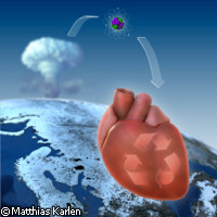 Forscher des Karolinska-Instituts in Schweden haben die strittige biomedizinische Frage beantwortet, ob das menschliche Herz neue Zellen erzeugen kann oder ob es von Geburt an mit einer vorbestimmten Anzahl von Zellen ausgestattet ist, die im Lauf der Zeit abnehmen, ohne wieder aufgefüllt zu werden. Ihre teilweise von der EU finanzierten und im Fachmagazin Science beschriebenen Erkenntnisse zeigen, dass im Verlauf des Lebens eines Menschen weniger als die Hälfte einiger Herzmuskelzellen (Kardiomyozyten) tatsächlich ersetzt werden. Die weitere Analyse dieses Prozesses könnte sich als ein Mittel zur Behandlung von durch Herzinfarkte beschädigten Zellen und der Umlenkung therapeutischer Strategien als sehr vorteilhaft erweisen. Die ein kostbares Organ wie das menschliche Herz betreffende Forschung sei wahrlich keine leichte Aufgabe, erläuterte Professor Jonas Frisén in einem Podcast-Interview mit dem Fachmagazin Science. So gäbe es zwar mehrere Methoden zur Untersuchung von Herzzellumsätzen bei Tieren, aber die Erkenntnisse aus derartigen Studien seien nicht ohne weiteres auf den Menschen anwendbar. Das Team kam auf eine alternative Strategie: "Anstelle der vorausschauenden Kennzeichnung von Zellen bestimmen wir rückwirkend das Alter der Zellen", erklärte Professor Frisén. Der neue Ansatz, der auch bei archäologischen Datierungen zum Einsatz kommt, profitiert auf unglaubliche Weise von einem geophysikalischen Ereignis. Bei den im Kalten Krieg zwischen 1955 und 1963 oberirdisch durchgeführten Atombombentests wurde massiv das radioaktive Isotop Kohlenstoff-14 erzeugt. Es war nur eine Frage der Zeit, bis sich die hoch angestiegenen Werte des in die Atmosphäre abgegebenen Kohlenstoff-14 in den Zellen der Pflanzen, Tiere, Menschen und anderen Lebensformen auf der Erde widerspiegeln würden. Seit des Verbots dieser Art von Versuchen seien die Kohlenstoff-14-Werte in unserer DNA sehr schnell abgesunken, erläuterte Professor Frisen. Dieser Rückgang geht auf die Aufnahme in "Biotopen" und die Verteilung zurück, was zu unterschiedlichen Werten in der Atmosphäre zu verschiedenen Zeitpunkten resultiert. Die Forscher setzten das Isotop auf geschickte Weise ein, um den Zeitpunkt der Zellerneuerung zu bestimmen. Sie nahmen bei Herzzellen von Menschen, die vor und nach den Atombombenversuchen geboren wurden, Kohlenstoff-Datierungen vor, um zu bestimmen, wann die DNA-Synthese in diesen Zellen stattfand. Den Forschern zufolge verhält es sich folgendermaßen: "Wenn eine Zelle innerhalb der letzten zehn Jahre zu verschiedenen Zeitpunkten im menschlichen Körper entstanden ist, trägt sie in ihrer genomischen DNA das integrierte Kohlenstoff-14 in einer Menge, die genau der Menge in der Atmosphäre entspricht. So können wir durch das Messen des Kohlenstoff-14 in der DNA von Zellen ein Datum markieren, das in die DNA der Zellen eingeschrieben ist und beweisen, wann sie entstanden sind. Auf diese Weise können wir rückblickend sagen, wie alt die Zellen sind und daraus schlussfolgern, wie viel Zellumsatz es dort gegeben haben muss." Nach rund 4 Jahren an Untersuchungen haben Professor Frisén und sein Team nun bewiesen, dass Kardiomyozyten, die rund 20% der Zellen des menschlichen Herzens ausmachen, sich ab dem Alter von 25 Jahren jedes Jahr mit einer Rate von 1% erneuern. Dieser Wert reduziert sich schrittweise auf rund die Hälfte dieser Rate im Alter von 75 Jahren. "Unsere Daten zeigen, dass das Herz neue Kardiomyozyten erzeugen kann", sagte Professor Frisén. "Ich finde diese Erkenntnisse sehr aufregend, da sie die zukünftige Möglichkeit aufzeigen, zu verstehen, wie das Ganze reguliert wird, und möglicherweise [zu] versuchen, die Regulation zu modulieren, um den Prozess der Generierung von Kardiomyozyten zu stimulieren, was natürlich nach dem Verlust von Kardiomyozyten, beispielsweise nach einem Herzinfarkt, von enormem Vorteil sein könnte." Er betonte außerdem die Attraktivität pharmazeutischer Therapien, die eingeführt werden könnten, um die Generierung dieser Herzzellen anzukurbeln. Zu diesen Erkenntnissen beitragende Forschung wurde von Wissenschaftlern durchgeführt, die an Instituten in Frankreich und den USA sowie an anderen schwedische Forschungszentren arbeiten.