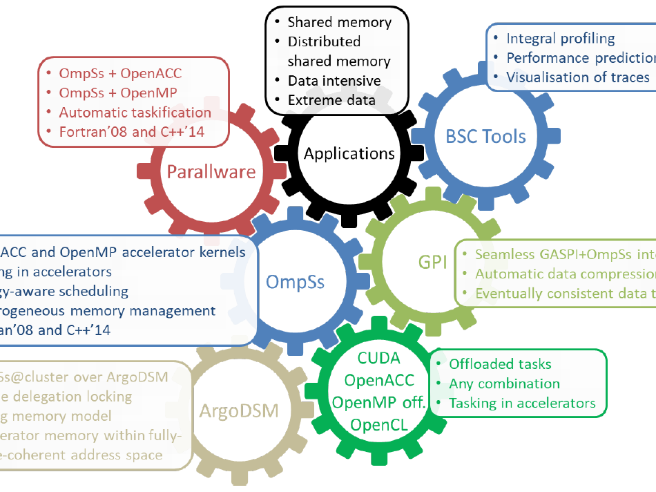 As the high-performance computing (HPC) community works to address the heterogeneity of upcoming exascale computers, different architectures of processing units (such as GPUs and FPGAs), heterogeneous memory systems (including non-volatile and persistent memories) and networks need to be addressed. The EPEEC project is taking on this challenge, having compiled five software components developed by European research institutions and companies to fine-tune and develop for its programming environment. OmpSs is a shared-memory programming model based on directives and tasking, forerunner of initiatives for the OpenMP Standard. In the context of EPEEC, OmpSs is being developed to include accelerator directives and tasking within accelerators, seeking impact on the OpenMP and OpenACC standardization bodies toward improved programming model composability. The developments of a distributed-shared memory backend on top of the ArgoDSM middleware to seamlessly distribute OmpSs workloads across compute nodes will ease cluster deployments while optimizing performance with respect to state-of-the-art solutions. GASPI is a distributed-memory programming model that is established as the European lead on one-sided internode communication. Developments in EPEEC include automatic data compression and eventually-consistent collectives, along with enhanced interoperability with runtime systems implementing intranode programming models. OmpSs+GASPI programming will offer an alternative to the ArgoDSM backend for developers seeking large-scale deployments. Parallelware is a static analysis tool that will help users get started on porting their serial codes to parallel computing, by providing hints to directive annotation in OmpSs, OpenMP, and OpenACC. Extrae, Paraver, and Dimemas are performance tools that offer bleeding-edge performance analysis and are being evolved to cover EPEEC’s programming models. AVBP, DIOGENeS, OSIRIS, Quantum ESPRESSO, and SMURFF are the five applications involved in the project. Coming from different fields and covering compute-intensive, data-intensive, and extreme-data scenarios, these are serving as excellent co-design partners and will be leveraged as pre-exascale demonstrators. These components will tackle issues in high programming productivity, high execution efficiency and scalability, energy awareness, and smooth composability/interoperability. Running from 1st October 2018 to 30th September 2021 with a budget of €3,9 million, EPEEC - European joint Effort toward a Highly Productive Programming Environment for Heterogeneous Exascale Computing – brings together 10 European research institutions and companies with the common goal of developing and deploying a production-ready parallel programming environment that turns upcoming overwhelmingly-heterogeneous exascale supercomputers into manageable platforms for domain application developers.