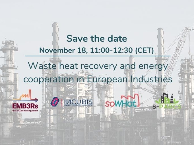 The smart and sustainable energy projects SO WHAT, EMB3RS, INCUBIS and S-PARCS are organizing a joint webinar: Waste heat recovery and energy cooperation in European Industries, to be held on November 18.