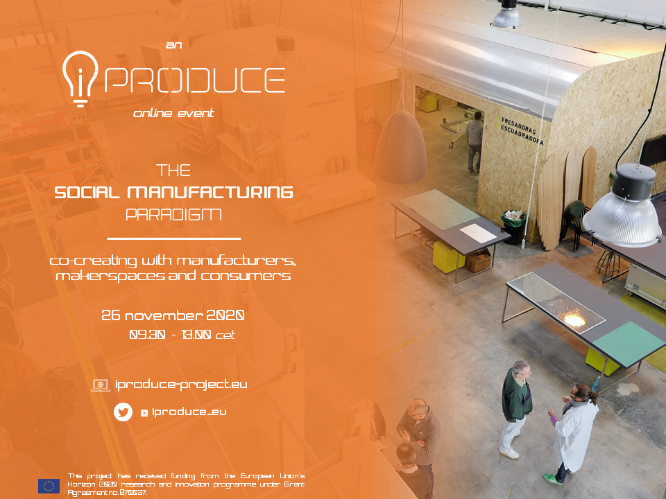 Join the iPRODUCE project’s online event – The Social Manufacturing Paradigm: co-creating with manufacturers, makerspaces, and consumers – next 26 November 2020 where we will discuss the role of these actors in the social manufacturing process, the current state of play, key challenges, and how iPRODUCE, the POP-MACHINA and OPEN!NEXT projects, and researchers David Cuartielles and César García are looking to make an impact in this area.