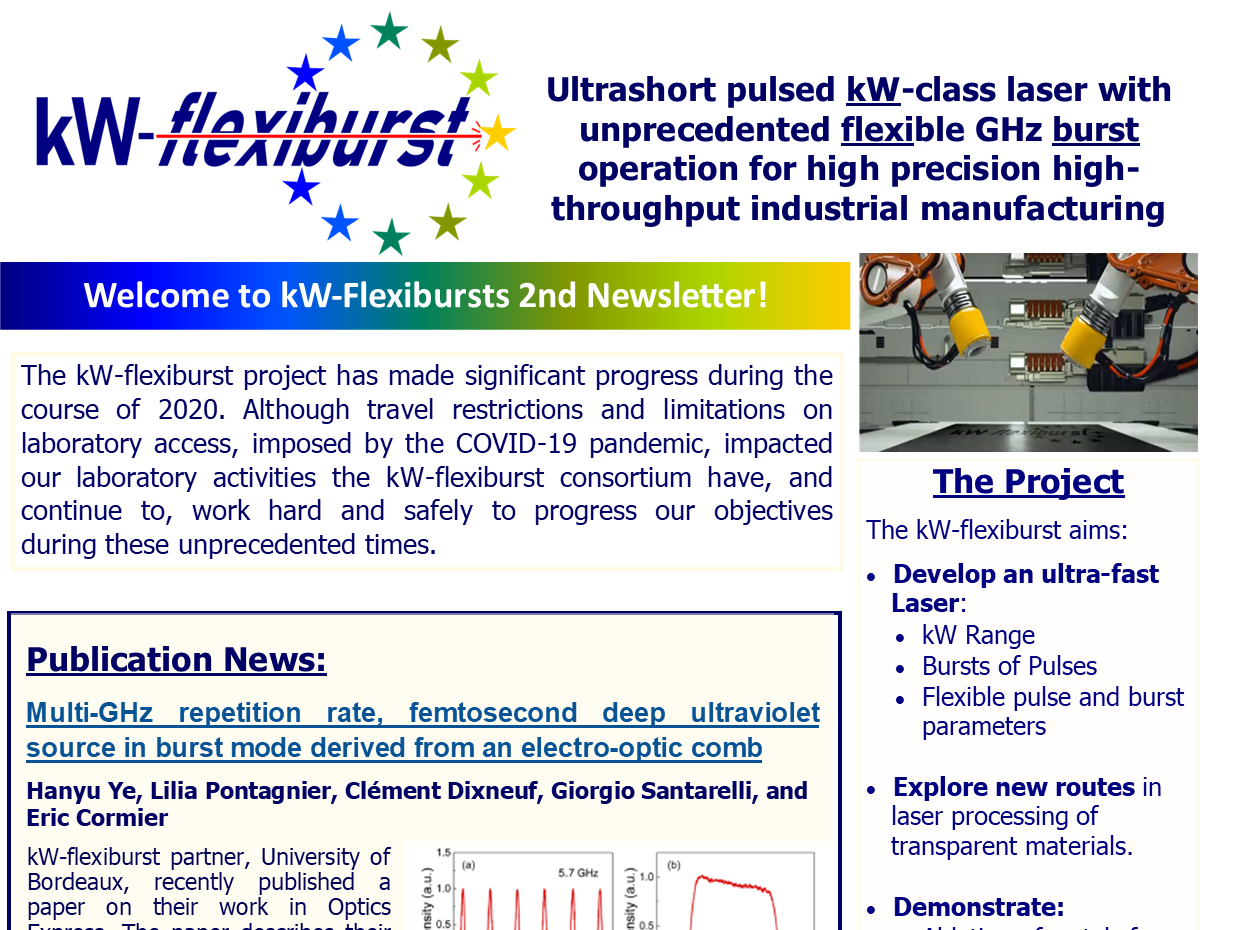 The kW-Flexiburst project has made significant progress during the course of 2020. Although travel restrictions and limitations on laboratory access, imposed by the COVID-19 pandemic, has impacted our activities the kW-Flexiburst consortium have, and continue to, work hard and safely to progress our objectives in line with local guidance. Access to the full newsletter can be found here: www.kw-flexiburst.eu/2nd-newsletter Keep up to date with the kW-Flexiburst progress and achievements by signing up to our contact list: www.kw-flexiburst.eu/contact-us or follow us on Twitter (www.twitter.com/kW_flexiburst) and LinkedIn (www.linkedin.com/in/kw-flexiburst-project-298254182)