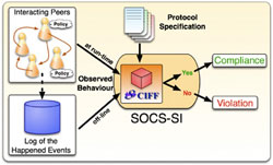 Offrant des principes, des méthodologies et des modèles architecturaux, les SOA (Service Oriented Architectures, architectures orientées services) se sont affirmées en tant que nouveau paradigme de structuration des processus d'information inter- et intra-entreprise. La composition de services Web, dans laquelle les fonctions commerciales sont encapsulées dans des composants logiciels et peuvent être invoquées via une pile de normes Internet, constitue un exemple concret de telles architectures. Dans ce contexte, le besoin de normes plus sophistiquées et, en particulier, d'une méthode de test en cours d'exécution de la conformité aux règles et aux spécifications a motivé le recours au modèle intitulé Society Constraint IFF. Le modèle SC-IFF a été mis au point dans le cadre du projet SOCS afin de constituer un langage formel de définition des protocoles d'interaction des agents. Sa contrepartie opérationnelle est essentiellement basée sur la procédure de vérification abductive IFF et peut être utilisée pour vérifier la conformité de services Web individuels à des protocoles ou chorégraphies mondiaux. Le modèle SC-IFF a été intégré dans la 'SOCS society infrastructure' (SOCS-SI), une application logicielle en langage Java capable de surveiller les interactions des agents et de les transférer au modèle SC-IFF pour analyse. La structure SOCS-SI utilise comme sources les spécifications des chorégraphies, ainsi que les événements qui se produisent, et fournit à l'utilisateur les résultats des calculs du modèle SC-IFF en matière de conformité via une interface utilisateur graphique. En plus de la vérification de conformité en cours d'exécution qu'elle permet par la vérification immédiate des événements entrants à partir de différentes sources, l'infrastructure SOCS-SI est capable d'analyser les fichiers journaux contenant des évènements pertinents. L'infrastructure SOCS-SI, jointe à ses procédures de vérification, constitue un cadre attrayant pour les concepteurs de services Web désireux de réfléchir aux attentes, protocoles sociaux et propriétés dans un contexte marqué par le caractère partiel des informations. De plus, elle pourrait déboucher sur de nouveaux concepts en matière d'ingénierie des sociétés d'agents, fruits d'un raisonnement sur les propriétés et aidés en cela par des outils de vérification formellement identifiés.