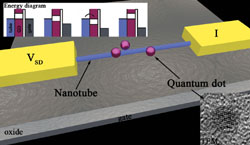 Insbesondere auf Quantenebene stecken in der Wissenschaft mehr Innovationen, als man erahnen kann. Miniaturbaugruppen wie Sensoren können, dank der Verwendung von Nanomaterialien, für den Einsatz in der Wissenschaft und der Technologie hergestellt werden. Das EU-finanzierte QDCN-Projekt ("Quantum Devices Based on Carbon Nnanotubes") entwickelt extrem empfindliche Detektoren, mit denen die Untersuchung der elektrischen Eigenschaften von einzelnen Molekülen durchführbar ist. Solch ein Detektor besteht aus kleinsten Elementen, sogenannten Kohlenstoffnanoröhren (Carbon Nanotubes – CNT), die etwa die Dicke von einem Fünfzigtausendstel der Dicke eines menschlichen Haares besitzen. Um zu funktionieren, müssen bei diesen Detektoren Halbleiter eingesetzt werden, also Materialien mit einer spezifischen elektrischen Leitfähigkeit. Eine neuere und leistungsfähigere Form eines Halbleiters im Nanomaßstab ist der Quantenpunkt: Er erhöht die Leitfähigkeit und wird zur Herstellung besserer Bauteile als die momentan verfügbaren herangezogen. Um die elektrischen Eigenschaften eines individuellen Moleküls zu messen, werden Quantenpunkte auf nur einer Elektrode, die aus einem einzelnen CNT besteht, aufgebracht. Der Vorteil des Einsatzes einer CNT als Elektrode besteht in einer lokalen Abschirmung von der Elektrode, wodurch sich bessere Möglichkeiten einer Untersuchung der elektrischen Struktur des Halbleiterpunkts ergeben. Dies stellt einen neuen, effizienteren Ansatz dar, der während des Projekts entwickelt wurde, um innovative Sensoren und Detektoren herzustellen. Diese neue Anordnung von Nanobaugruppen vereinfacht den Herstellungsprozess im Vergleich zu den Standardeinheiten, bei denen zwei Elektroden Anwendung finden, die durch eine wenige nanometergroße Lücke getrennt sind. Dies ist wichtig, da der Herstellungsprozess solcher Baugruppen sehr anspruchsvoll sowie zeitaufwendig ist, darüber hinaus kommen hier zahlreiche Verfahren und komplizierte Geräte zur Anwendung. Der nächste Schritt des Projekts bestand in der Charakterisierung der hergestellten Nanobaugruppen und in der Bestimmung ihrer Genauigkeit. Dies gelang unter Einsatz einer neuen Methode mit der Bezeichnung "Electron Counting Spectroscopy", bei der Messungen bei niedrigen Temperaturen vorgenommen werden. Dieses Verfahren ermöglicht es Forschern, die elektrischen Eigenschaften von Halbleiter-Quantenpunkten zu ermitteln. Zudem ist es möglich, halbleitende Quantenpunkte mit Elektronen aufzufüllen oder diese zu entfernen, eine bisher mühsame Aufgabe. Zusätzlich zur Schaffung eines Detektors gelang es während des Projekts, verschiedene Herstellungsmethoden für Nanobaugruppen wie eine Vielzahl von Verfahren und eine Reihe von Vorrichtungen auf Quantenebene zu entwickeln. Hierzu gehören frei schwebende Baugruppen aus Nanoröhrchen, Graphenelemente, Vierleiter-Nanoröhrchen aus Gold und katalytische Nanomotoren. Die Fortschritte des Projekts ermöglichen zudem die umfangreiche Beeinflussung der Fermienergie (der Energie am absoluten Temperaturnullpunkt). Dies ist besonders für die Elektrotechnik auf Nano- oder Molekularebene vielversprechend, da eine starke Beeinflussung und "Trennung" der Energie bei solchen Anwendungen begrenzt ist. Das QDCN-Projekt hat gezeigt, dass der Nachweis eines einzelnen Elektrons mit einem CNT-Transistor eine neue Möglichkeit darstellt, die Aufteilung der Energie zwischen den diskreten energetischen Niveaus eines halbleitenden Quantenpunkts zu untersuchen. Insbesondere konnte gezeigt werden, dass die energetischen Niveaus eines Quantenpunkts ein chaotisches Verhalten aufweisen können, ein Phänomen, das in den vergangenen Jahrzehnten nur theoretisch untersucht wurde.