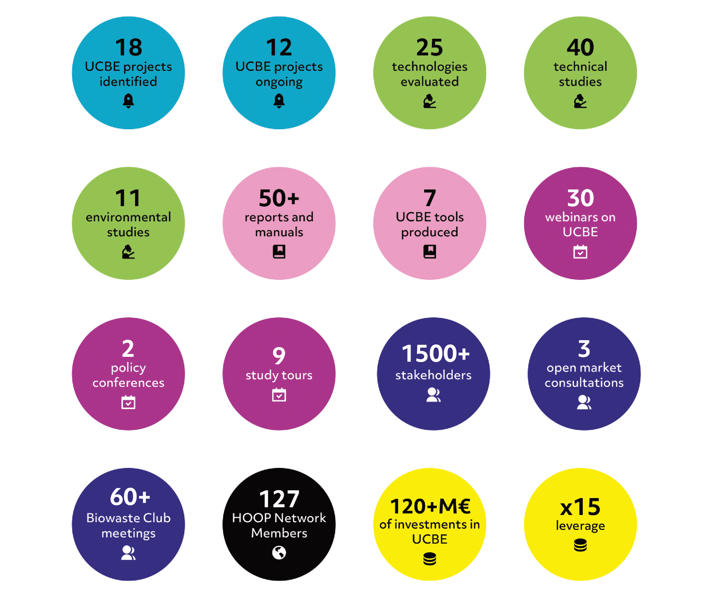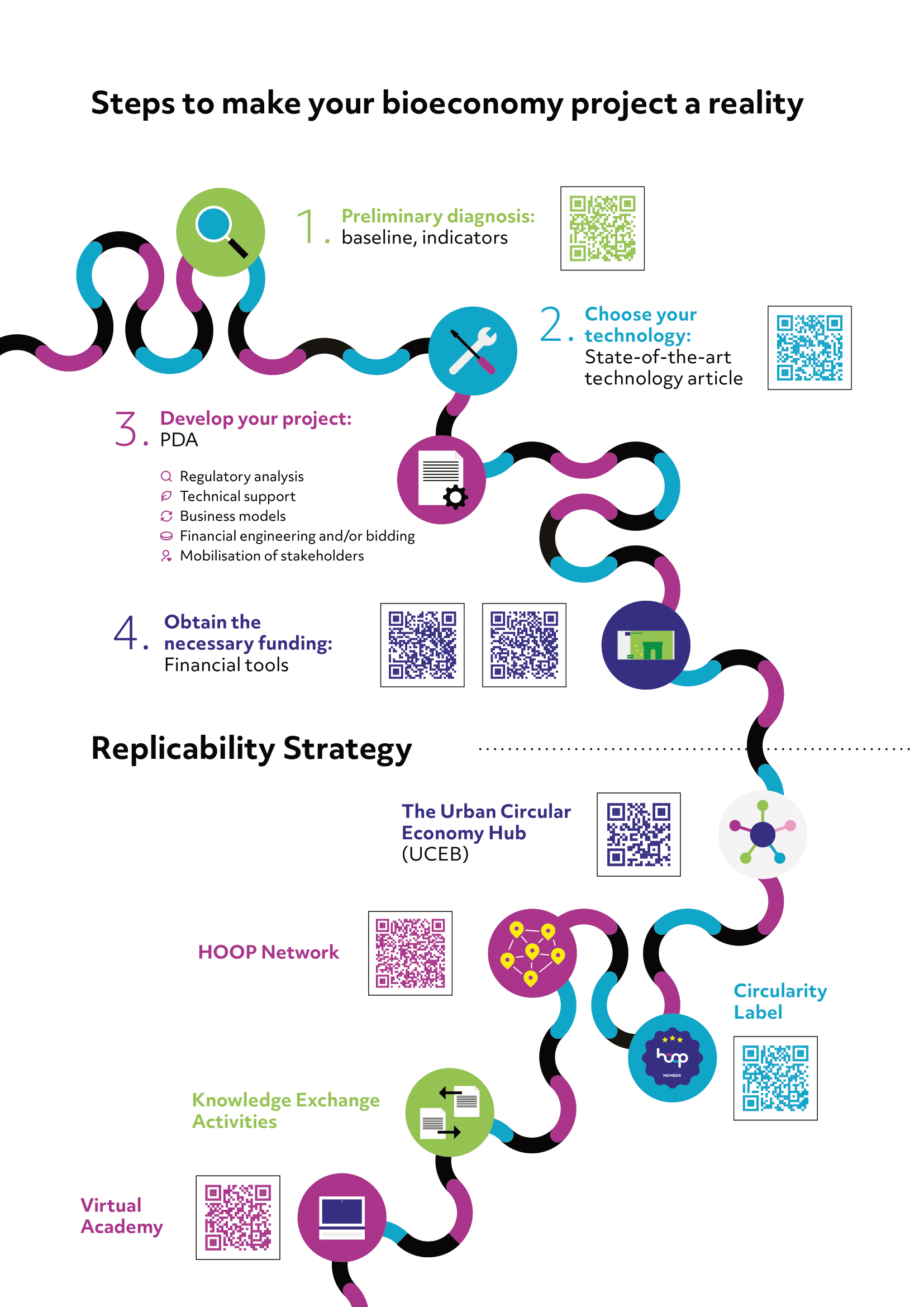 The PDA consisted of technical and environmental studies, business models, financial engineering, assistance to launch innovative public procurement and stakeholder engagement. The experiences and best practices from the LHs followed a replicability strategy through the UCBE HUB (hoop-hub.eu) a web-based platform comprising: the Virtual Academy, which compiles resources about UCBE (existing and original); the HOOP Network of cities and regions (C&R), offering a framework for discussion, exchange of experiences and knowledge about UCBE across Europe; and other sections of the platform providing self-assessment tools to evaluate the circularity of a territory or a project.