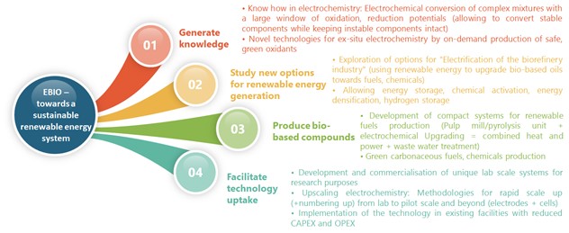 EBIO’s innovative concept focuses on electrochemical upgrading of two typical industrially available biomass-based liquefied feedstocks, i.e. black liquor and fast pyrolysis oil, through successive hydrogenation and decarboxylation. Process design and optimisation includes electrode materials, reaction cells, separation / purification, upscaling and integration into existing pulp mills and pyrolysis processes. Products aimed at specifically will have a higher energy density and stability, a lower averaged molecular weights, and less diverse oxygen functionalities in the molecules, as compared to the original feeds. This allows better blending / mixing with existing refinery streams and results in higher overall yields (in terms of carbon in the product, such as chemicals and biofuels).