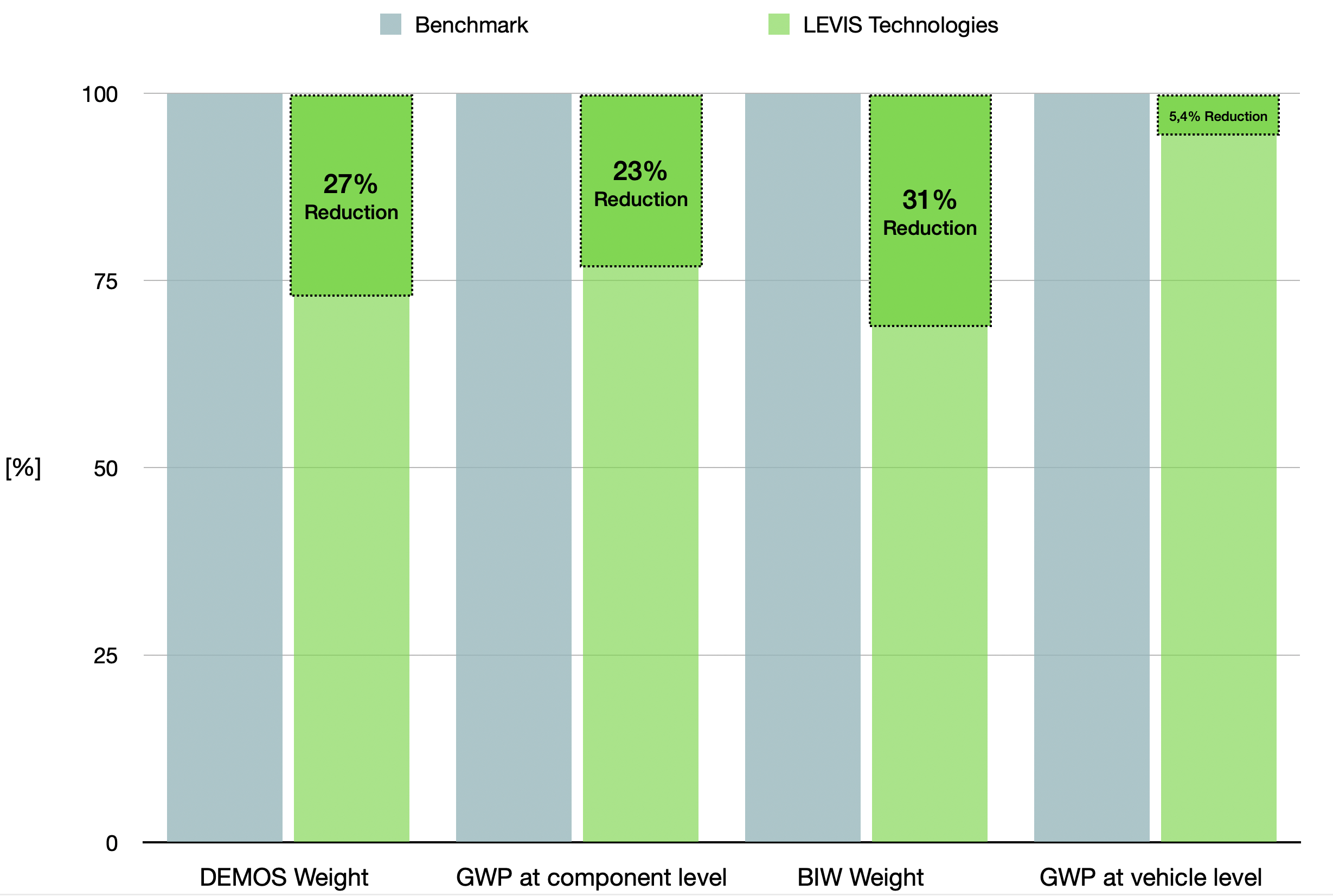 LEVIS has focused on achieving a significant weight reduction (around 20-40%), adopting sustainable processes with an equivalent final cost, thanks to the optimised deployment of advanced light materials. Along with vehicle weight reduction, the novel sensor technologies will enable the monitoring of the structural integrity during the service life of the components, to identify safety and performance issues early. One-shot production approaches will be adopted to speed up production and reduce the time-to-market of the new components. To cover the whole lifecycle, strategies for the circular use of the end-of-life elements will allow the recycling of 80% of the materials. This has been validated through a Life Cycle Assessment for the project demonstrators, while the techno-economic viability has been assessed in a Life Cycle Costing report.