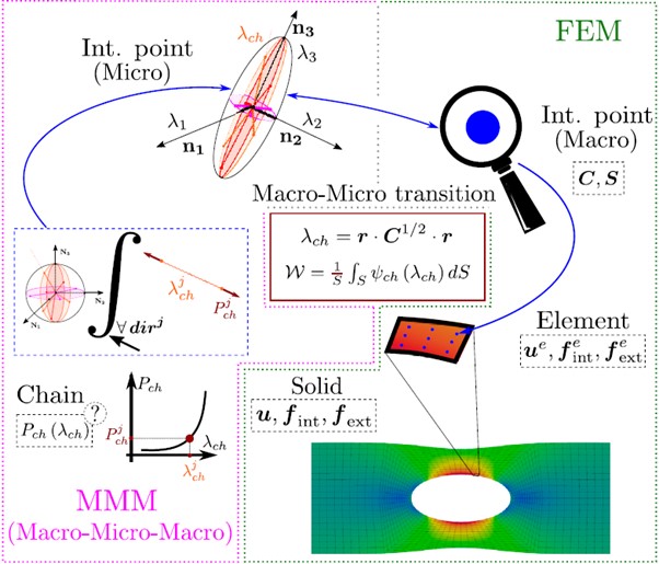 The third one is the development of technologies to cross scales in constitutive modeling, in particular in nonlinear cases. We have developed a methodology to obtain constitutive behavior at the microscale from non-homogeneous tests at the continuum scale. For the moment, we have applied it successfully to obtain the macromolecule behavior in polymers, see figure. The next challenge is to extend it to general elastoplastic materials.