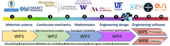 The first one is the preparation and characterization of the 3D printing process using Selective Laser Melting machines to print titanium-based metamaterials, including testing the 3D printed material under different conditions, the microstructural and defects characterization. UPM, Georgia-Tech and Alloyed are working on these topics.