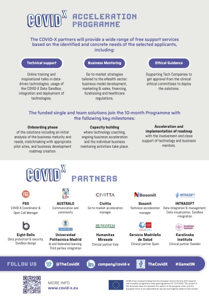COVID-X Programme accelerates the final steps towards the market uptake of top-rated data solutions. The programme provided financial support to the technology providers and healthcare partners, access to the Sandbox as technical infrastructure, and business, clinical and ethical support. The business support programme covered eight topics, offering general and individual sessions with topic-specific mentors and accompaniment from general mentors. The programme also included a clinical monitoring framework to monitor all pilots to ensure a high clinical impact and rapid response to achieve better patient outcomes, avoiding overtreatment and under-treatment conditions.