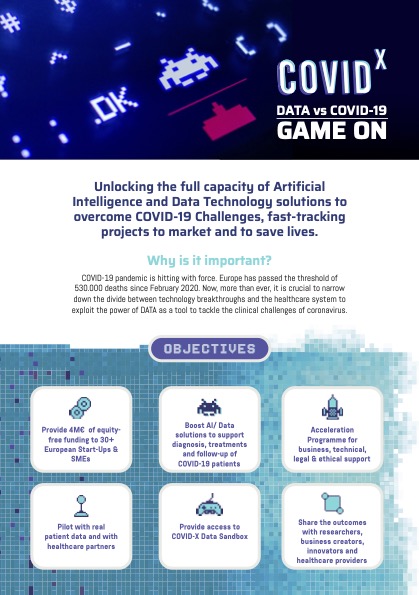 COVID-X brings together startup and SME providers of digital health solutions and healthcare systems. Solution providers are developing innovative eHealth solutions using artificial intelligence and big data but need help entering the healthcare market dominated by large companies. Healthcare providers are collecting massive amounts of data when diagnosing and treating patients. COVID-X bridges these two communities to validate innovative solutions in European clinical scenarios to support the diagnosis, treatment, and recovery of COVID-19 patients.