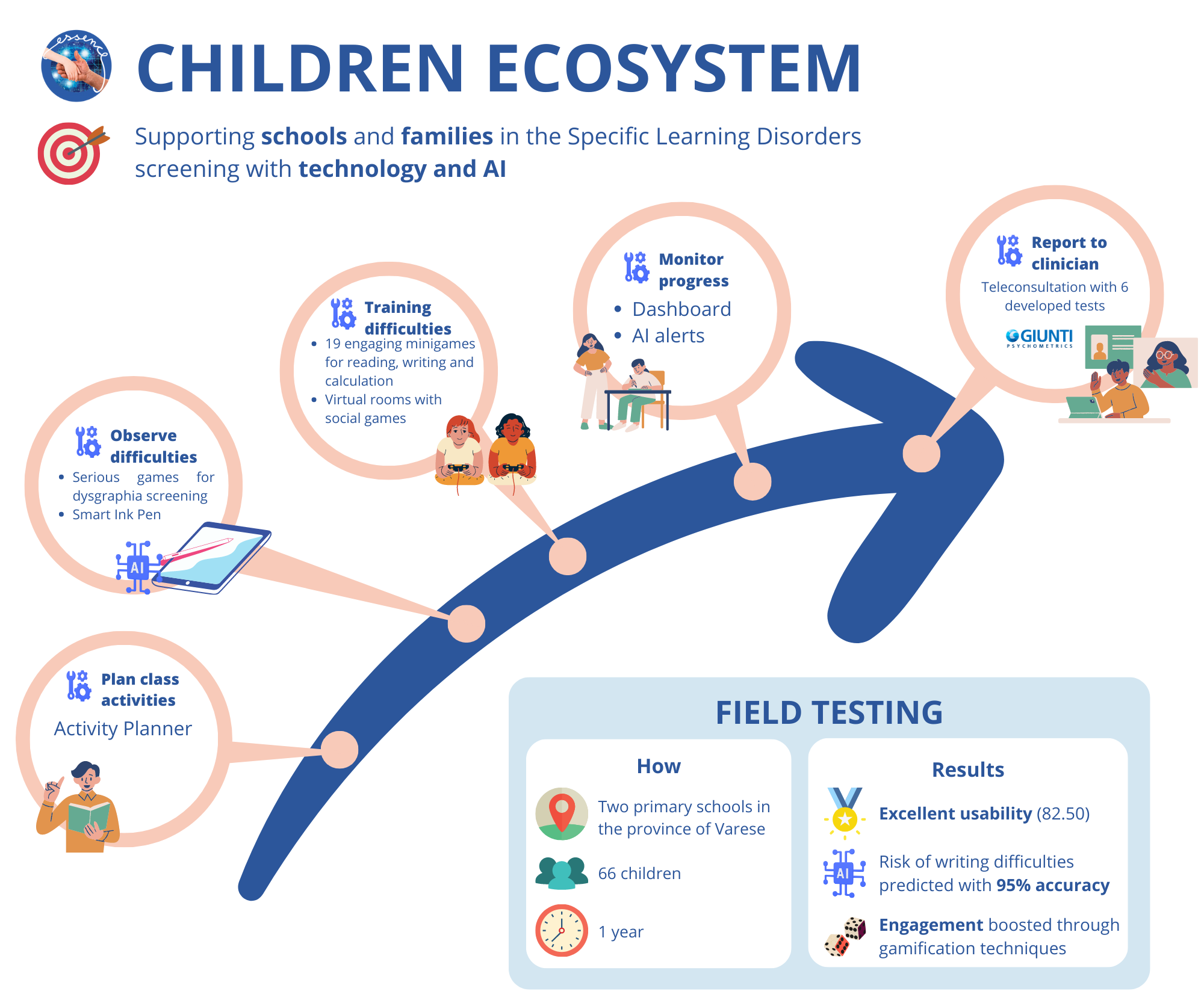 In the children ecosystem, 66 children attending the first and second grade of the primary school were recruited together with their teachers. Different activities were provided, such as, serious games for monitoring and training of learning problems, social inclusion, and to achieve a remote clinical evaluation at the point of need. Usability was high (median system usability score of 82), as well as satisfaction (92% of users were satisfied), and compliance was in line with expectations. It has been highlighted how the effect of personalization and gamification has influenced the compliance of children, which has significantly increased, together with the accuracy of their performance. AI algorithms trained on serious games for handwriting screening were able to detect problems with an area under the precision-recall curve of 0.84.