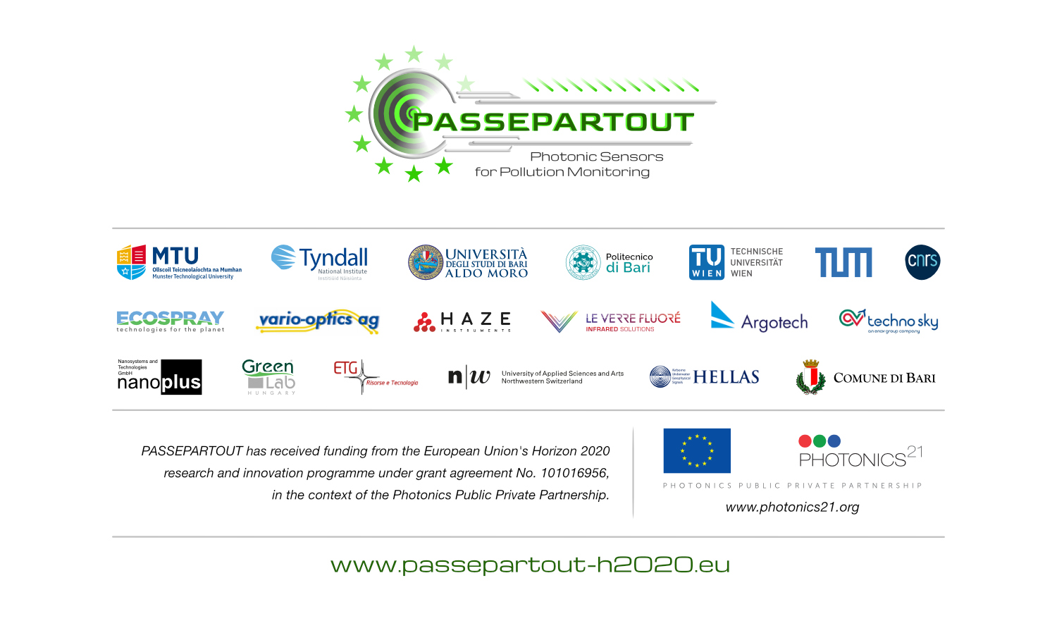 The ambient pollutant detectors currently used as reference measurements are impractical for widespread or mobile deployment, while miniature, low-cost electrochemical sensors generally are still not stable or sensitive enough for monitoring ambient pollutants reliably. The PASSEPARTOUT project will advance the development and deployment of miniature, hyperspectral optical based sensors, utilising Quartz Enhanced Photo-Acoustic Spectroscopy (QEPAS) and Photo-Thermal Interferometry (PTI) to detect a wide range of ambient pollutants. The PASSEPARTOUT optical sensors operate in the mid-infrared (MIR) or near-infrared (NIR) spectral range and allow calibration-free methodologies (since the quantification is based on the well-known optical constants of the target analytes) and will be compatible with the rigorous certification process.