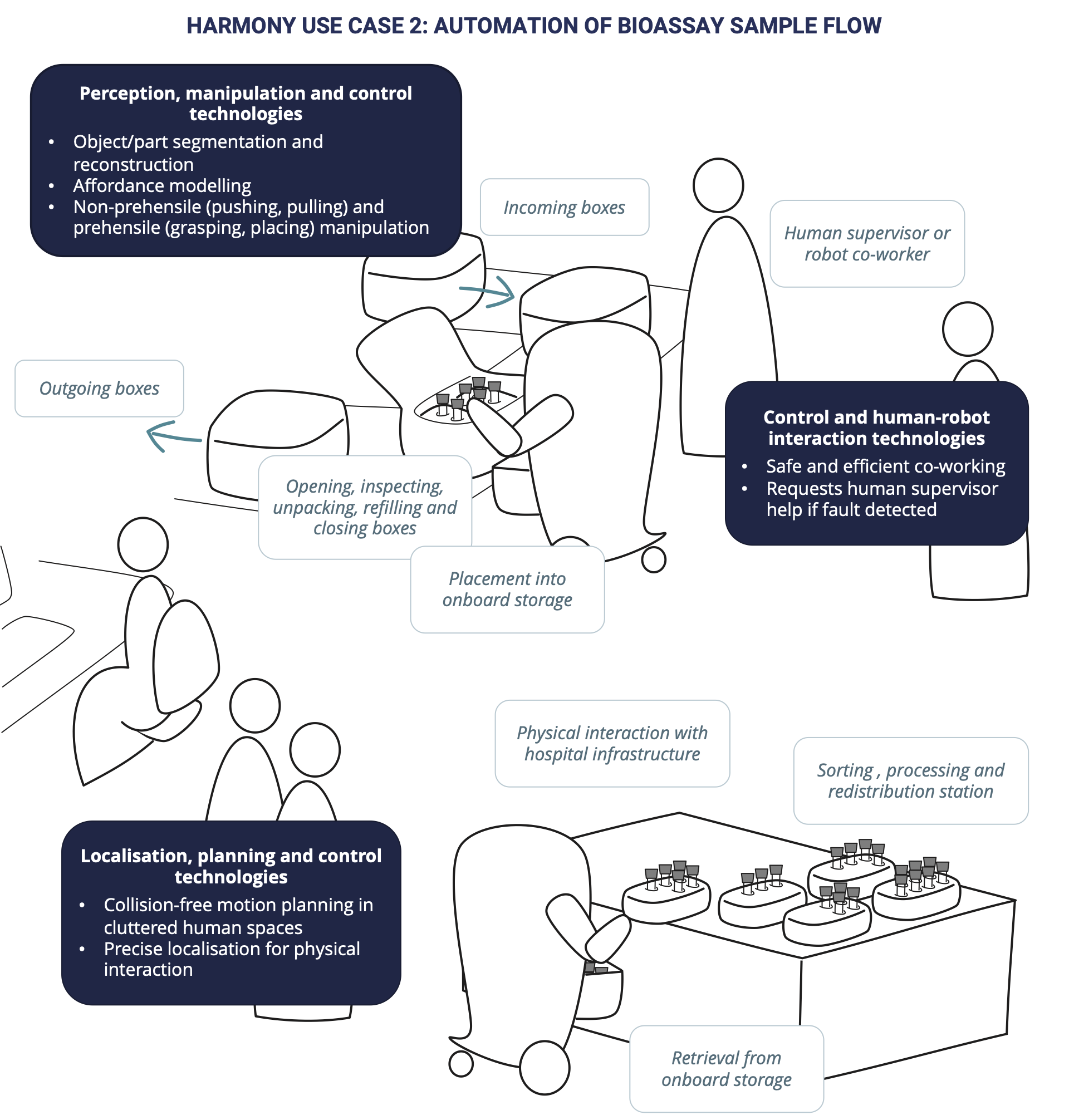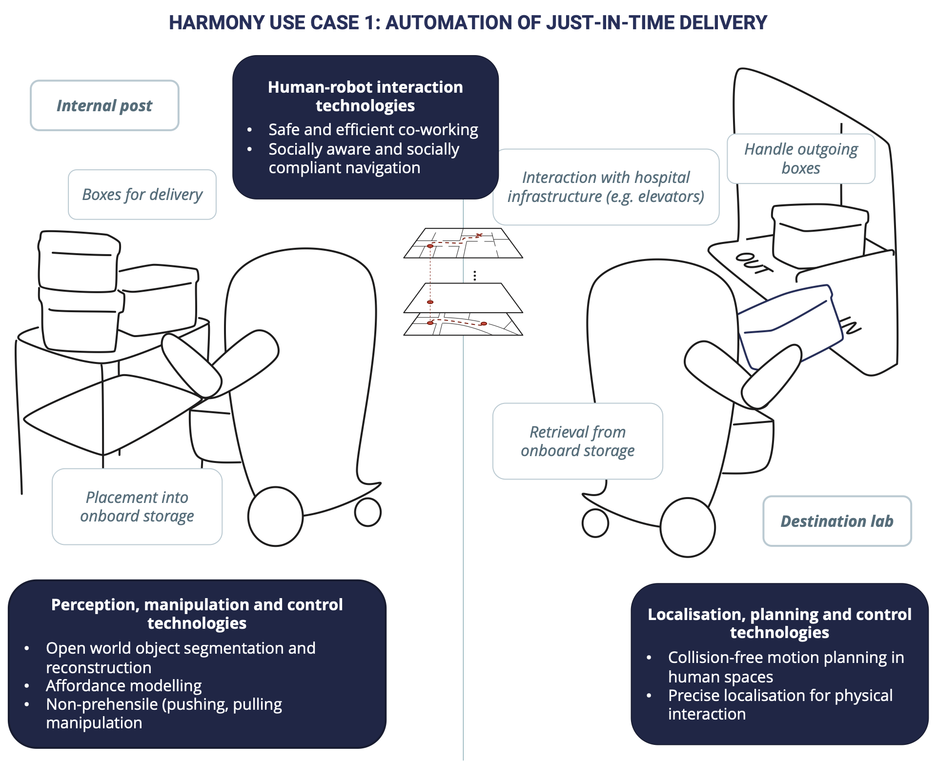 - Delivering strict guarantees on aspects such as safety, accuracy and patient privacy during navigation, handover, carrying and co-working tasks.