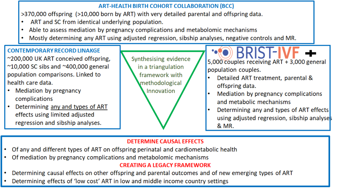 1. We are brining together three types of studies and applying different novel analysis methods to these different study times. One type of study brings birth cohorts from across the world together. These studies follow people from when they were in the womb during their mothers pregnancy, through birth, childhood and into adulthood. The strengths f this collaboration of birth cohorts is that we do not select on whether someone is conceived by ART or not. This means that those conceived by ART or natural conception are treated the same, with all the same measures on both groups. We can also look at whether any effect of ART changes over time as people get older. : The down side of the birth cohorts they often do not have detailed information on exactly how the ART was done. The second type of study is large electronic health record studies of whole populations. These have the advantages that they are very large, cover the whole population, such as the whole of the UK over many years, and are less likely to suffer from selection bias. They will have more details on the types of ART that were used compared to the birth cohorts. The down side of these is that they have less information on confounders than the birth cohorts. Lastly we are suing data from clinical cohort that has collected very detailed information on the whole ART process on 500 couples and for those who become pregnant comparing their pregnancy health and offspring later life health with a cohort of people from the same city who have the same measures from birth onwards. This will enable us to look at different aspects of the ART treatment, with much more detail than either of the first two. Across all three types of study we will use different types of analyses that have different biases. If se see similar results across the different study types and analysis types this gives us greater confidence that those results are the correct causal answer.