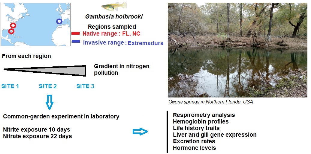 Three key questions related to evolutionary biology stand out in the study of biological invasions: i) Is the variable, environmentally-induced expression of life-history traits a key to invasion success? ii) How do genetics and biology of invasive species differ in their native vs. introduced areas? iii) Is environmental tolerance greater in invasive species and populations? In this project the invasive eastern mosquitofish (Gambusia holbrooki), whose invasion history is well known, is used as experimental model to characterize its tolerance to nitrogen pollution and identify mechanistic differences in its response between the native and invasive populations. Early warning molecular tools such as transcriptomics, but also whole organism responses like respiratory rates and life history traits are used to denote the health status of the experimentally exposed individuals to nitrogen pollution. This approach is then applied in three sympatric amphipod species in the Main river catchment. The overall objective is to understand the adaptive mechanisms that promote invasion success in a widespread invasive freshwater species.