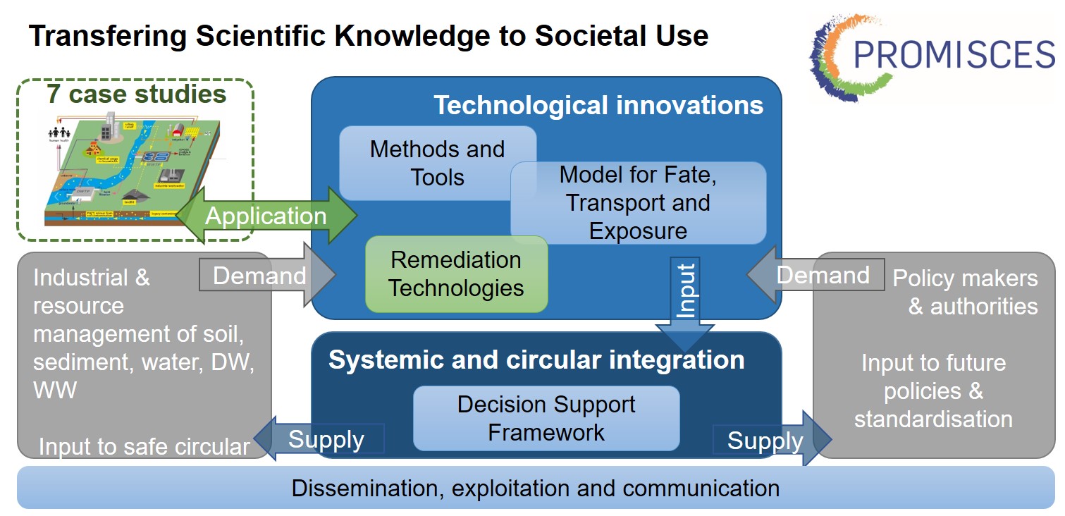 New analytical methods for, e.g. detecting and quantifying PFAS and iPM(T)s in waters and complex matrices have been validated up to TRL 7-8 to ensure implementation during and beyond the project. Models for toxicological properties, fate and transport and the assessment of human exposure and hence, risk, will be developed to a level of maturity enabling PFAS and iPMT(s) management support at TRL 7 for simple end-use. PROMISCES introduces an integrated set of innovative treatment and remediation concepts for removing PFAS and iPM(T)s from soil, sediments, sludge, groundwater, wastewater, landfill leachate and drinking water. State-of-the-art technologies for the remediation will be brought to TRL 4-6 using a combination of controlled experiments and demonstrators.