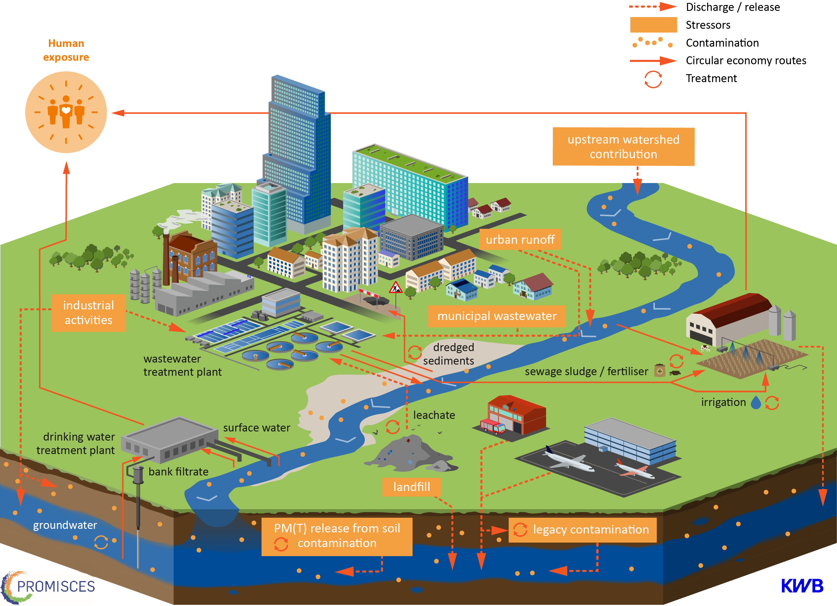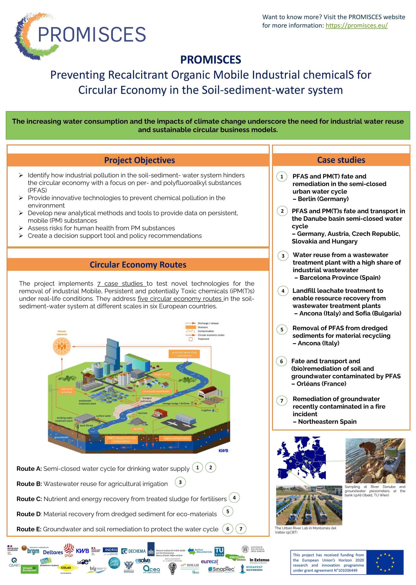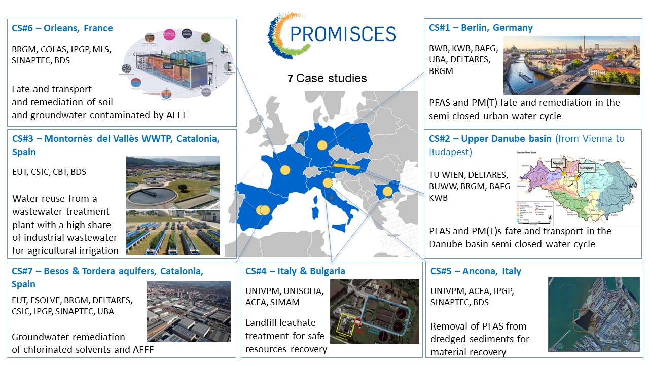 The PROMISCES activities considers CE routes including (i) semi-closed water cycles for drinking water supply at urban and catchment scale; (ii) wastewater reuse for irrigation in agriculture; (iii) nutrient recovery from sewage sludge; (iv) material recovery from dredged sediments and (v) groundwater and land remediation for safe reuse. These activities are centred on seven case studies, including locations in Spain, Italy, Bulgaria, France, Germany and the Danube river basin between Vienna and Budapest.