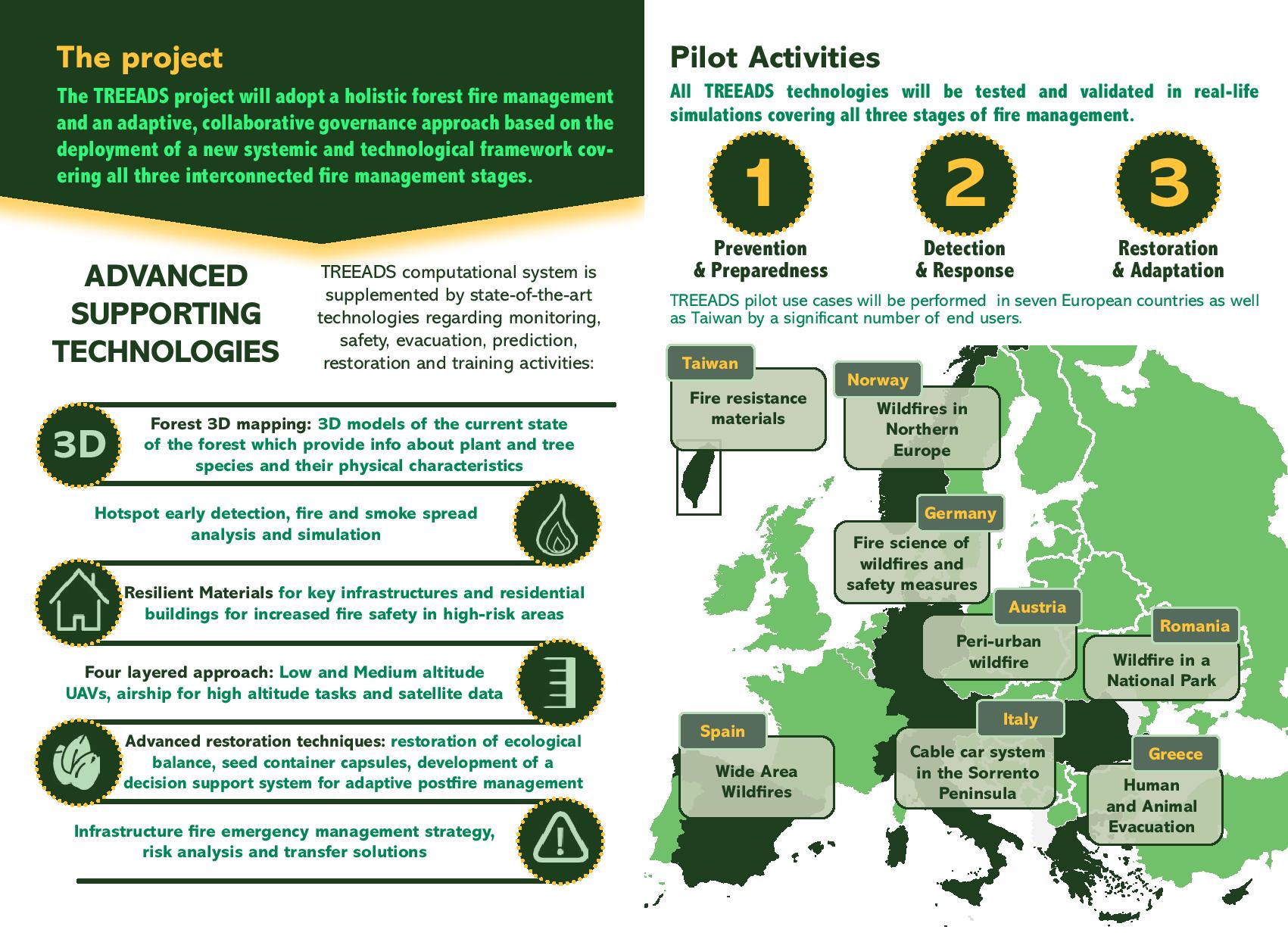 - Public and industrial impact: Wider awareness towards the importance of safety needs in the forests, and wildland urban interface(WUI) by TREEADS dissemination activities, including advisory groups, wildfire risk management (WFRM) clustering activities, and several public conferences.