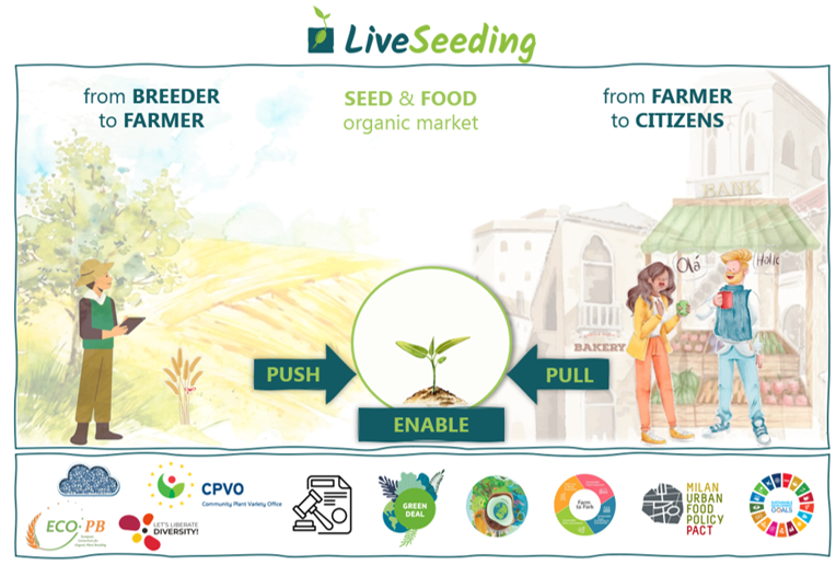 LiveSeeding primary ambition is to reach a quantum leap in the development of a strong and economically viable organic breeding and seed sector in Europe by following a supply-demand based PUSH-PULL-ENABLE strategy. As an Innovation Action LiveSeeding is adapting and applying science outcomes and practitioners’ experiences in the context of real networks ecosystems, with strong focus on market uptake and market replication. The development of KASP markers for novel crop-trait combination and breeding for agroforestry systems are very innovative. Analysis of the impact of organic vs. concentionally produced seed on the seed microbiome and seed vigour uses cutting edge technology. Evaluation environmental and social benefit of OHM and OV and embeding improved agrobiodiversity with city food policies opens new opportunities to accelerate the organic seed and breeding sector.