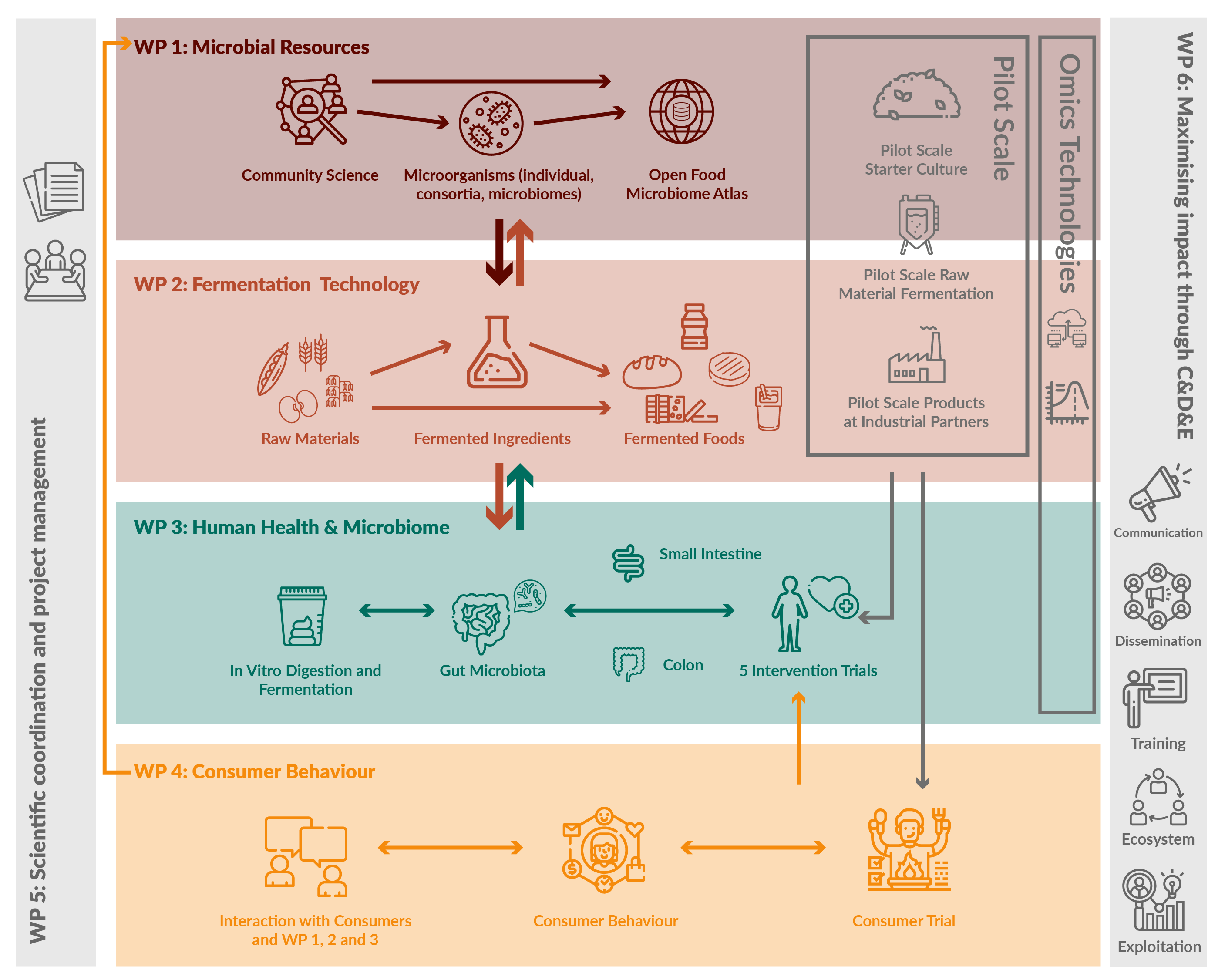 Drawing from a community science approach and strain collections, existing and novel microorganisms will be screened for suitability for innovative food fermentations. Fermentation processes of different grain-based raw materials will be optimised to develop solutions for liquid and (semi-)solid fermented foods, some of them as alternatives for dairy and meat-based foods. The impact of fermented grain-based foods on human health and the gut microbiome will be assessed in several intervention trials. To facilitate the inclusion of fermented plant-based foods in the diets of European consumers the role of social science and humanities (SSH) is crucial and integrated in all parts of the project. Consumer acceptance of fermented foods, their technologies and their role in the transition towards a more sustainable healthy diet will be studied in various social contexts. Finally, the consortium will strongly interact with stakeholders, build an ecosystem and train researchers to generate long-term impact.