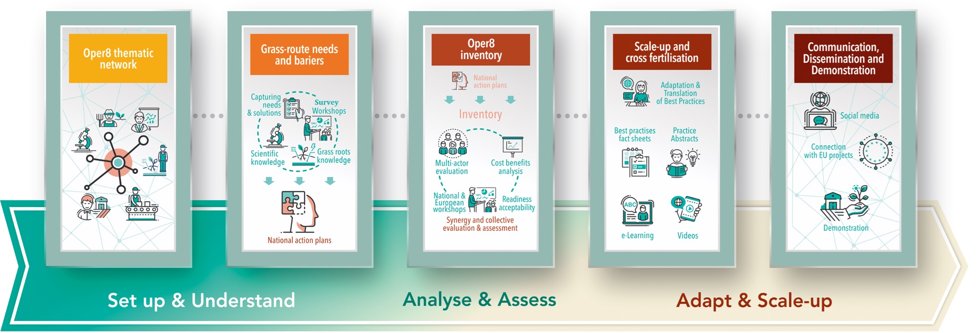 Oper8 has been designed to address EU policy recommendations, aiming to inform over 10,000 agri-food stakeholders. It includes e-learning modules, workshops, webinars, and demonstration events, with active participation from end users and AKIS stakeholders. The adaptable distribution method ensures sustainability through continuous stakeholder engagement and knowledge sharing.