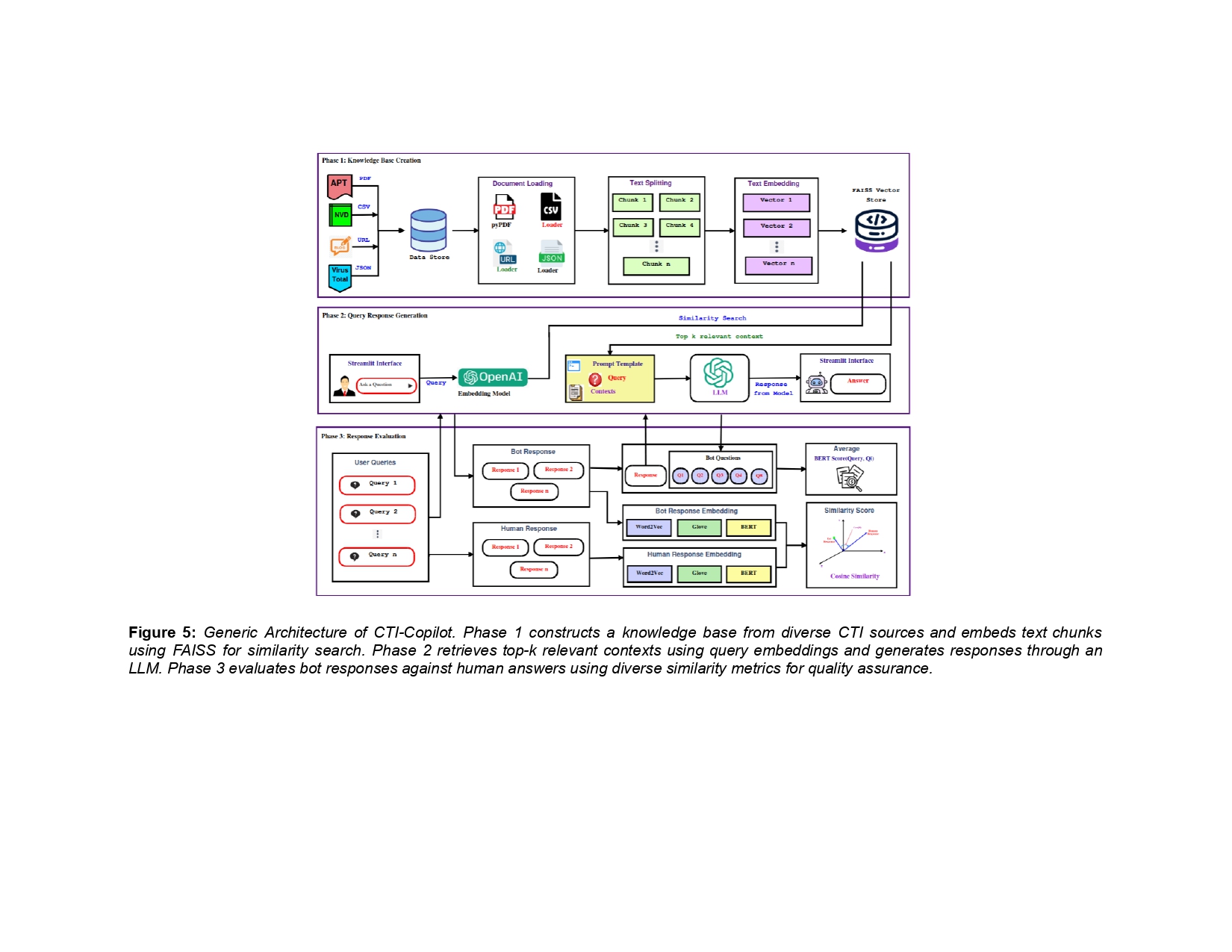 -IntellBot aggregates data from diverse sources such as threat reports, vulnerability databases, and CTI feeds. It achieves high relevance, with BERT scores > 0.8 and cosine similarity scores > 0.8–1.0 in Question Answer (QA) evaluations.