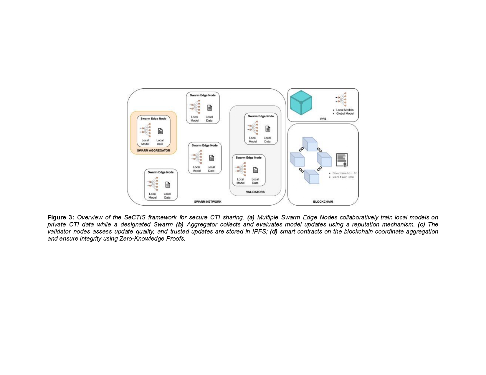 -Developed SeCTIS a secure CTI sharing framework which adopts an Swarm-Learning (SL) Network to generate a CTI Model in a distributed manner collaboratively. Since SL does not require data to be shared with a central entity, this decentralization protects data privacy as the raw data never leaves the local node, ensuring the confidentiality of each organization’s data.