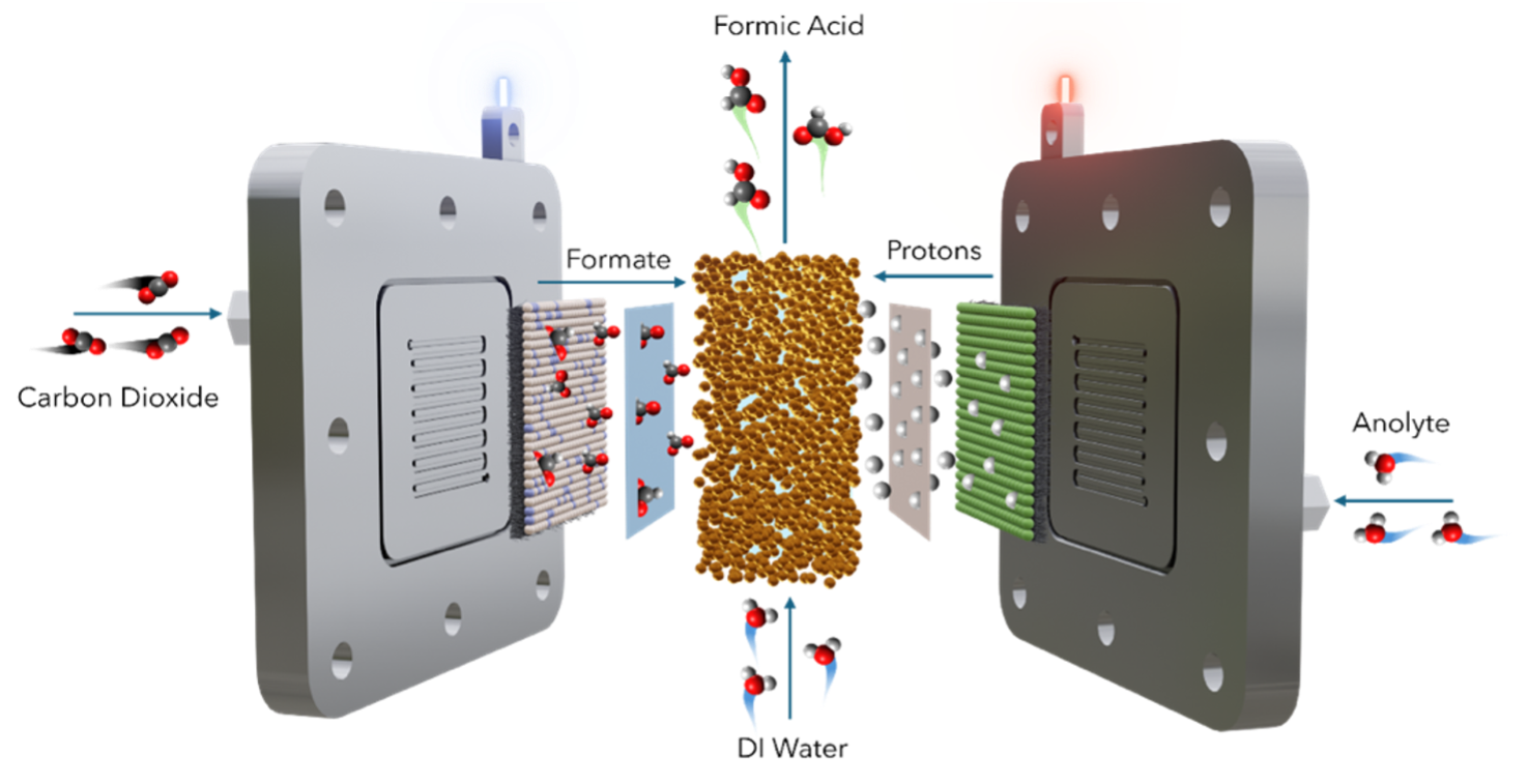 In the first two years of the project, ECOMATES has made substantial progress in advancing electrochemical technologies for the conversion of CO2 into valuable chemicals. The scientific work has focused on the design of advanced catalysts and membranes, the development of predictive computational tools, operando characterization, and the fabrication of functional electrochemical devices. A central achievement has been the synthesis and testing of copper-based bimetallic catalysts, modified with secondary metals such as zinc, tin, and silver. These materials were produced using controlled techniques including atomic layer deposition, solvothermal synthesis, and electrodeposition. The catalysts were integrated into gas diffusion electrodes and membrane electrode assemblies (MEAs) and evaluated for their selectivity toward products such as formate, carbon monoxide, and ethylene. Faradaic efficiencies exceeding 95% for CO2 conversion were achieved in some cases. In parallel, the project developed computational models based on density functional theory (DFT) and machine learning (ML) to predict the binding energies and stability of various catalyst configurations. These tools guided experimental efforts and supported the identification of promising compositions such as Cu–Al alloys. To support in-depth catalyst analysis, synchrotron-based X-ray characterization techniques — including operando spectroscopy and imaging — were introduced. In addition, innovative gas diffusion electrodes and ion-exchange membranes were developed, with the aim to maximize the efficiency of the novel catalysts in MEA configuration. A custom-designed electrochemical cell was developed for beamline compatibility, allowing in situ monitoring of catalyst behavior. Finally, ECOMATES progressed in assembling lab-scale electrolyzer prototypes, which are currently being tested to assess stability, efficiency, and scalability. A key development is the fabrication of a three-compartment electrolyzer, specifically designed for high-purity liquid product generation. This device was guided by computational simulations and technoeconomic analysis and has demonstrated robust performance under relevant conditions. These efforts have laid a strong foundation for the next phase of the project, which will focus on catalyst refinement, long-term performance testing, and scaling up device integration.