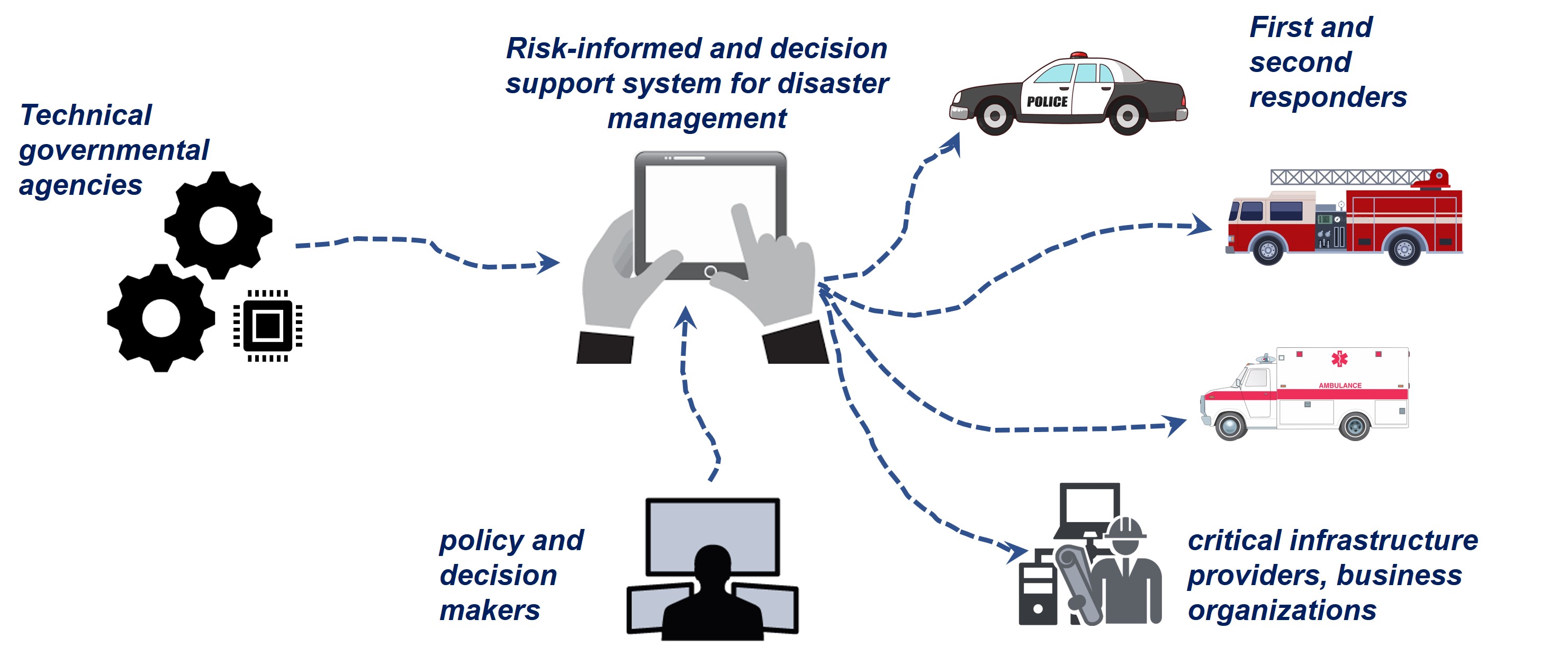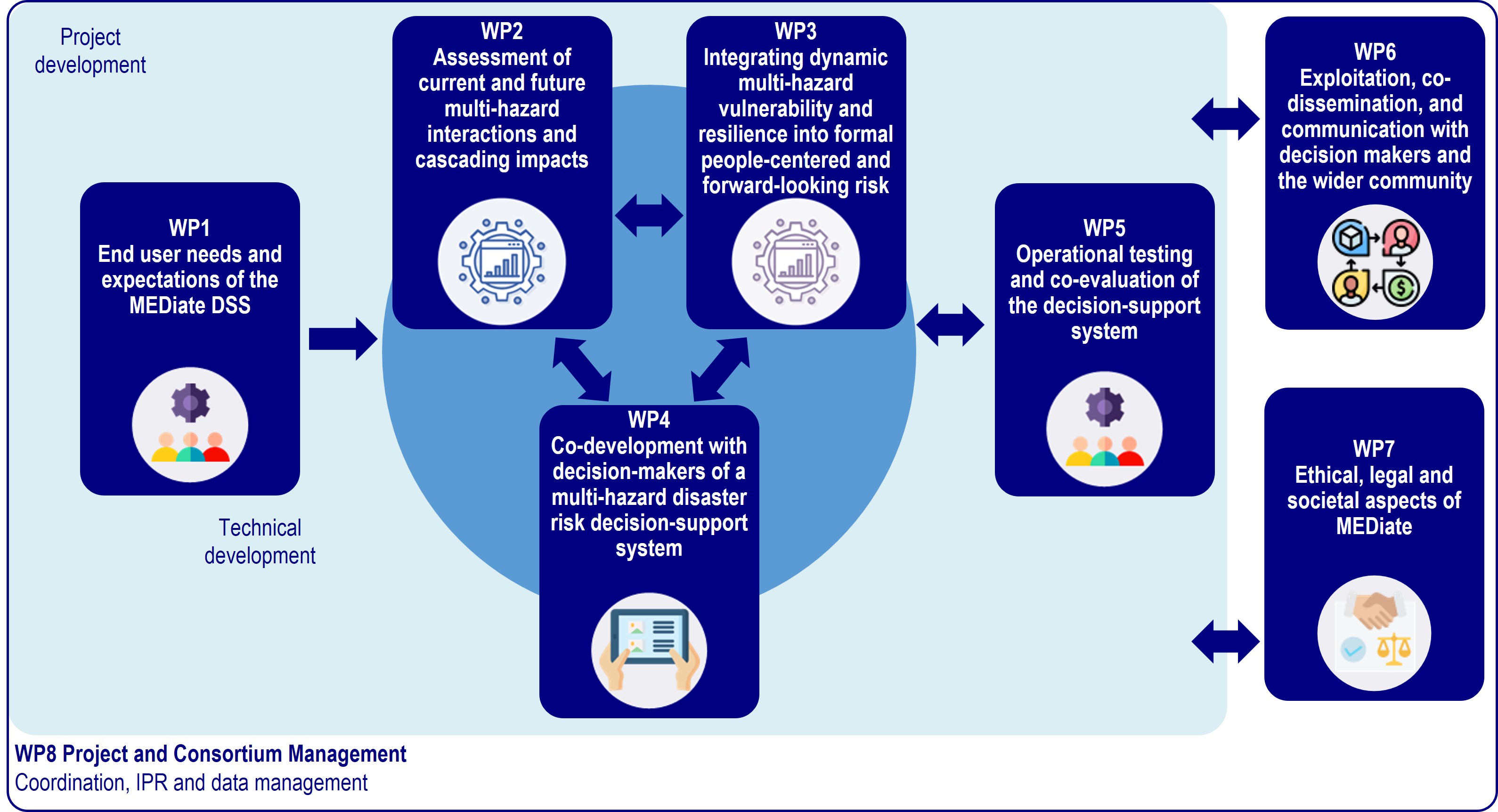 The overall objective of MEDiate is to contribute to enhancing societal resilience against multiple interacting natural hazards and cascading impacts and strengthen disaster risk governance to manage disaster risk through a framework that not only uses a novel resilience-informed, people-centric and service-oriented approaches, but also accounts for forecasted modifications in the hazard, exposure, and vulnerability. The primary deliverable from MEDiate will be a decision support system in the form of service-orientated web tool and accompanying disaster risk management framework providing end users with the ability to build scenarios, enable more reliable risk and resilience assessments, and to model and evaluate the potential impact of their mitigation and adaptation risk management actions to reduce vulnerability and enhance community resilience. The scenarios can be based on a combination of the historical record and future climate change projections to forecast the location and intensity of climate related disaster events and to predict their impacts, including cascading impacts, on the vulnerability of the local physical, economic and social systems. The project involves a multi-disciplinary team of geophysical and meteorological scientists, risk engineers, social scientists, information technologists and actors in disaster risk management, working together to ensure that the system is user-led and supported by appropriate technology. The project focuses on co-design, co-development and co-evaluation of the solutions with local and regional actors in disaster risk management from four different testbeds: Oslo (Norway), Essex (UK), Nice (France), Mulathing (Iceland).