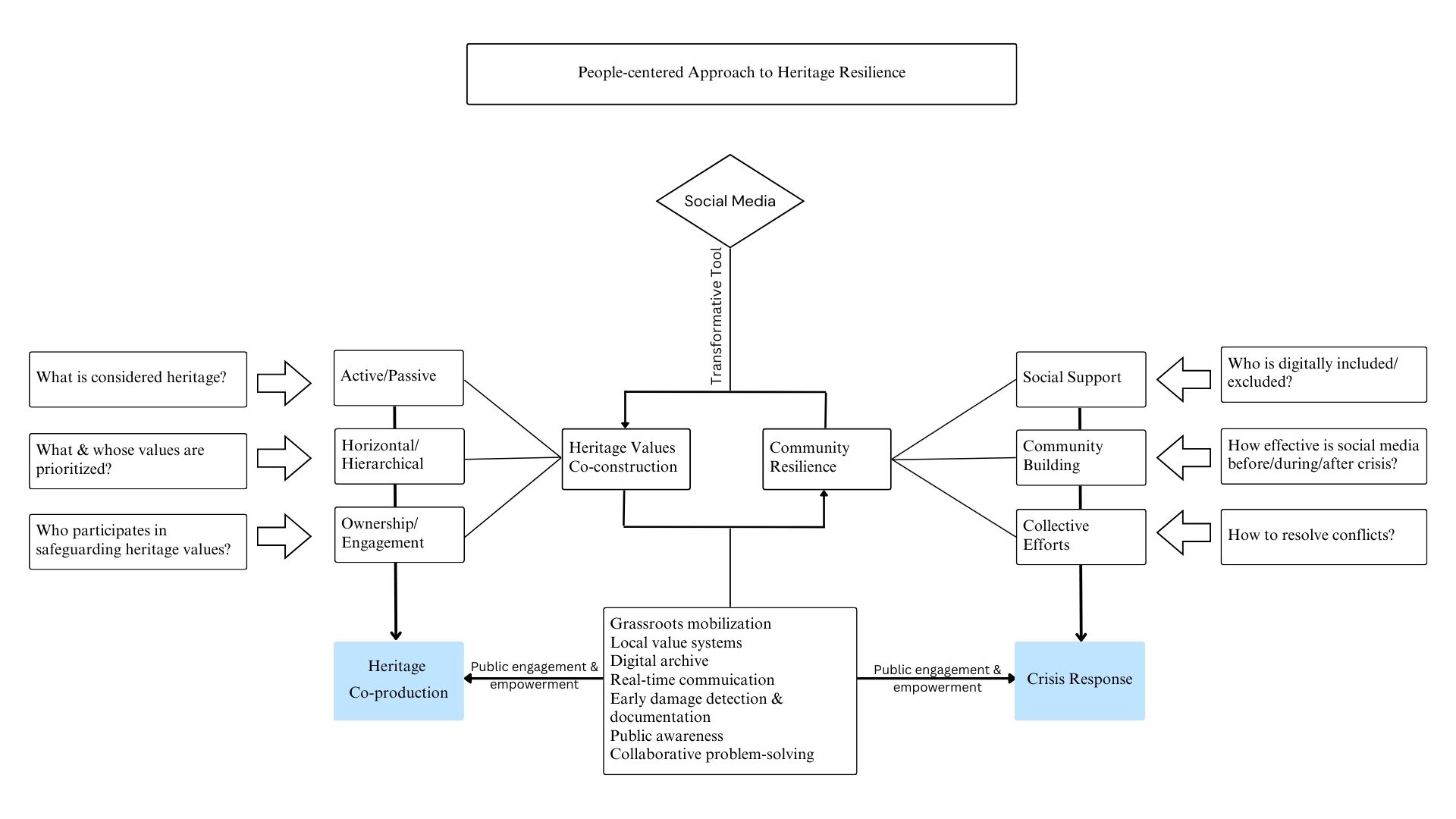 Development of a people-centered conceptual framework articulating the role of social media in heritage conservation and community resilience in the context of climate change. The framework advocates for more inclusive and locally contextualized practices by engaging communities in the co-construction of heritage values and enhancing multivocality through digital platforms. It highlights the transformative role of digitally mediated heritage practices, from digitization and crowdsourcing to active community participation in crisis response.
