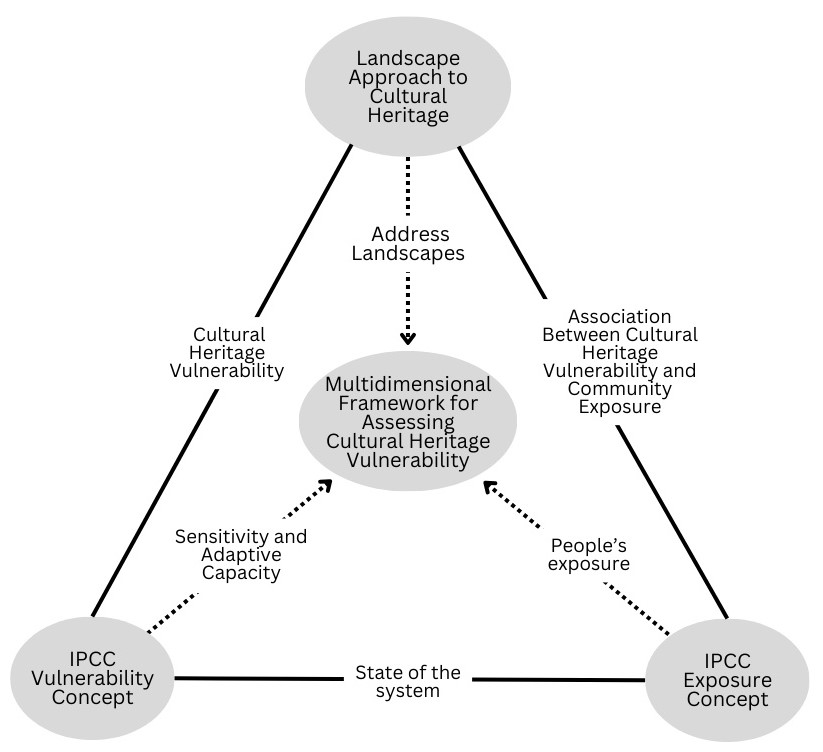 Development of a multidimensional framework for the assessment of cultural heritage vulnerability to flood hazards. In this framework, cultural heritage is framed within a landscape approach drawing on the concept of the historic urban landscape as a physical entity, a lived space and a layered socioeconomic environment. The framework integrates built and natural heritage with area-based vulnerability and socioeconomic deprivation, considering households' exposure to flood risk. This involved a systematic review of existing methods, indicator development, data collection, and spatial analysis using GIS-based tools.