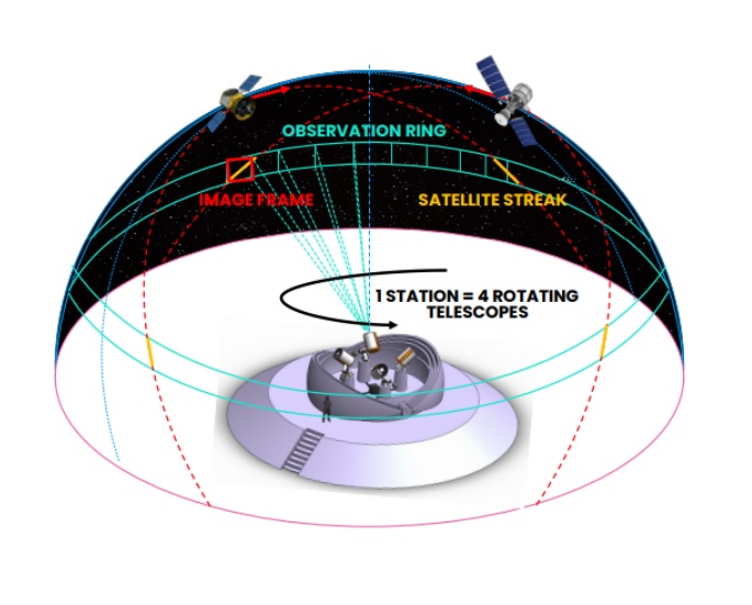 2 - The development of a specific telescope to equip Aldoria's Multi-Telescope Observation Stations (MTOS) and expand the size of Aldoria's catalogue. These MTOS should be positioned around the world in specific locations for an efficient sky coverage. An MTOS is a modular optical system that enables the detection, tracking and characterization of all space objects in sight, across all orbits. Thanks to powerful embedded processing algorithms, it is scanning the sky permanently. Our system is made of 4 passive telescopes, that are located at the same observation site and rotate synchronously. Their rotation rate is coordinated with the transit time of objects in the field of view to ensure that all space objects are detected, even at low altitudes down to 300km. Each telescope has its own remote-controlled mount, which means that the 4 telescopes can also be controlled independently to track and further characterize specific objects.