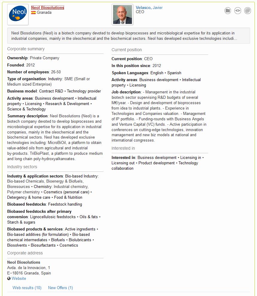 • Developing a partnering platform to overcome the fragmented nature of IB expertise in Europe thus aiding in the development of new alliances in this area. The BIO-TIC partnering platform provides a free database by which users can advertise their expertise and needs within this sector. It contains details of over 5,000 stakeholders covering the value chain from feedstock supply, its transformation and integration into industrial processing up to end-user industries and service providers. The platform facilitates networking, contact and business opportunities between e.g. companies, academia and venture capitalists.