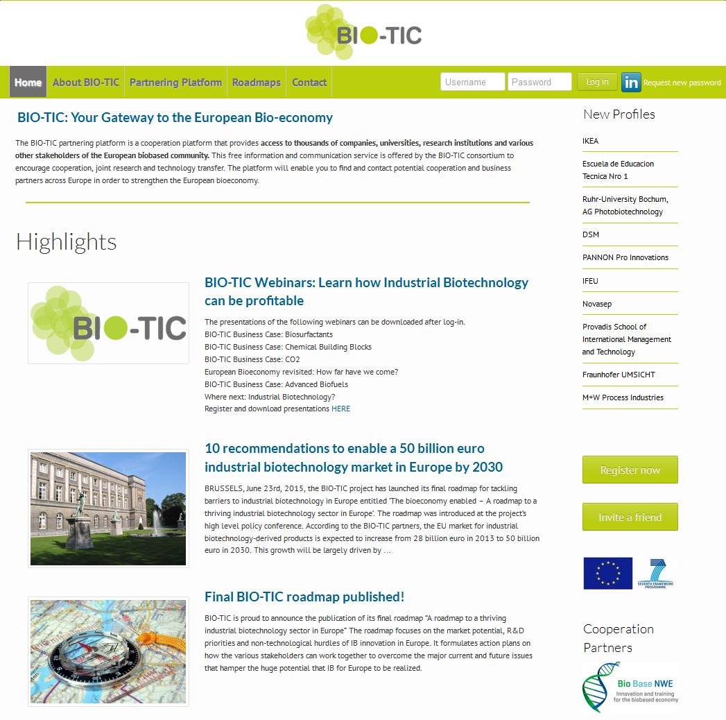 Consequently the BIO-TIC partners decided to relaunch the platform. The goal was to streamline the platform, discard the variety of different databases within the BIO-TIC platform and focus on interactivity among the users. In addition, in order to link the BIO-TIC and BBI-JU platforms (see below), the structure of both platforms was adjusted. The new BIO-TIC platform was launched in March 2015. The platform is now much easier to use and is very similar to the platform used at BBI-JU.