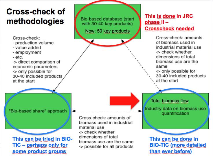 The goal of the bio-based database was to build a dedicated database for bio-based products (example for this is the energy database of the EU). The main challenge on this concept was the complexity of the bio-based product sectors mainly in the field of material uses with more than 1,000 potentially bio-based products already identified, from several areas with a large base of different sources from which to collect the data. Establishing this kind of a database will be a long process and to obligate all Member States to provide data (even if the political will is there) will be even more complicated. In the EU Bioeconomy Observatory the JRC is working together with a team led by E4Tech on the database methodology based on a very comprehensive data collection from the industry (database approach). Since the database approach is pursued in that project, nova and the BIO-TIC team decided to focus on the other two methodologies. By the end of the BIO-TIC project the JRC project was not yet finished and only very limited data from the database approach were available, therefore a cross-check was not possible.