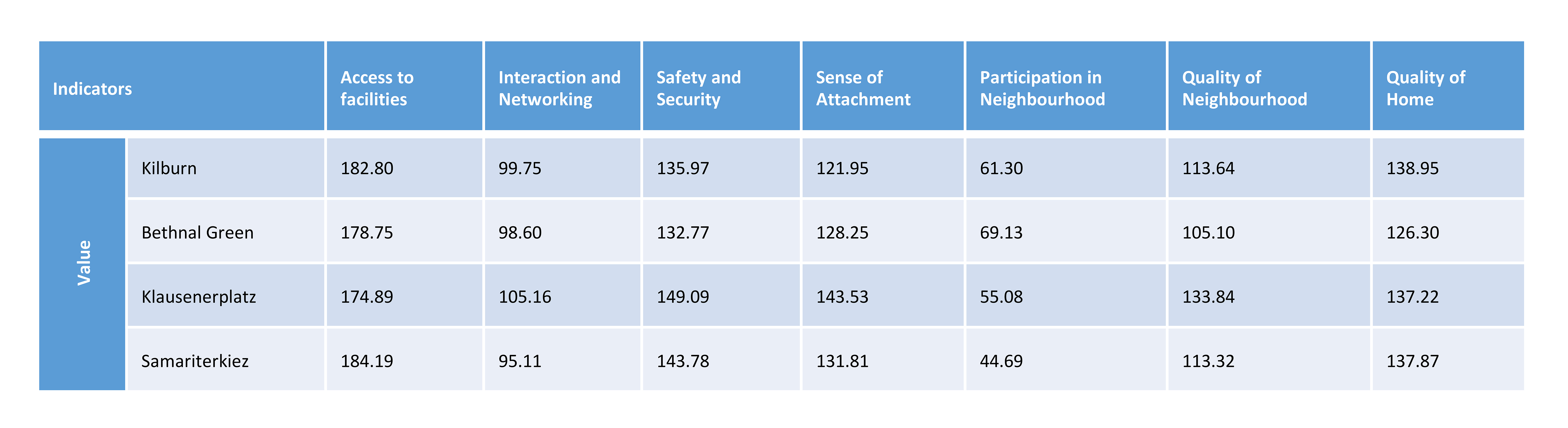 Comparing the four neighbourhoods, Klausenerplatz with a social sustainability value of 128.40 is the most socially sustainable neighbourhood. The rating for the other neighbourhoods are Kilburn [122.02] Samariterkiez [121.53] and Bethnal Green [119.84].