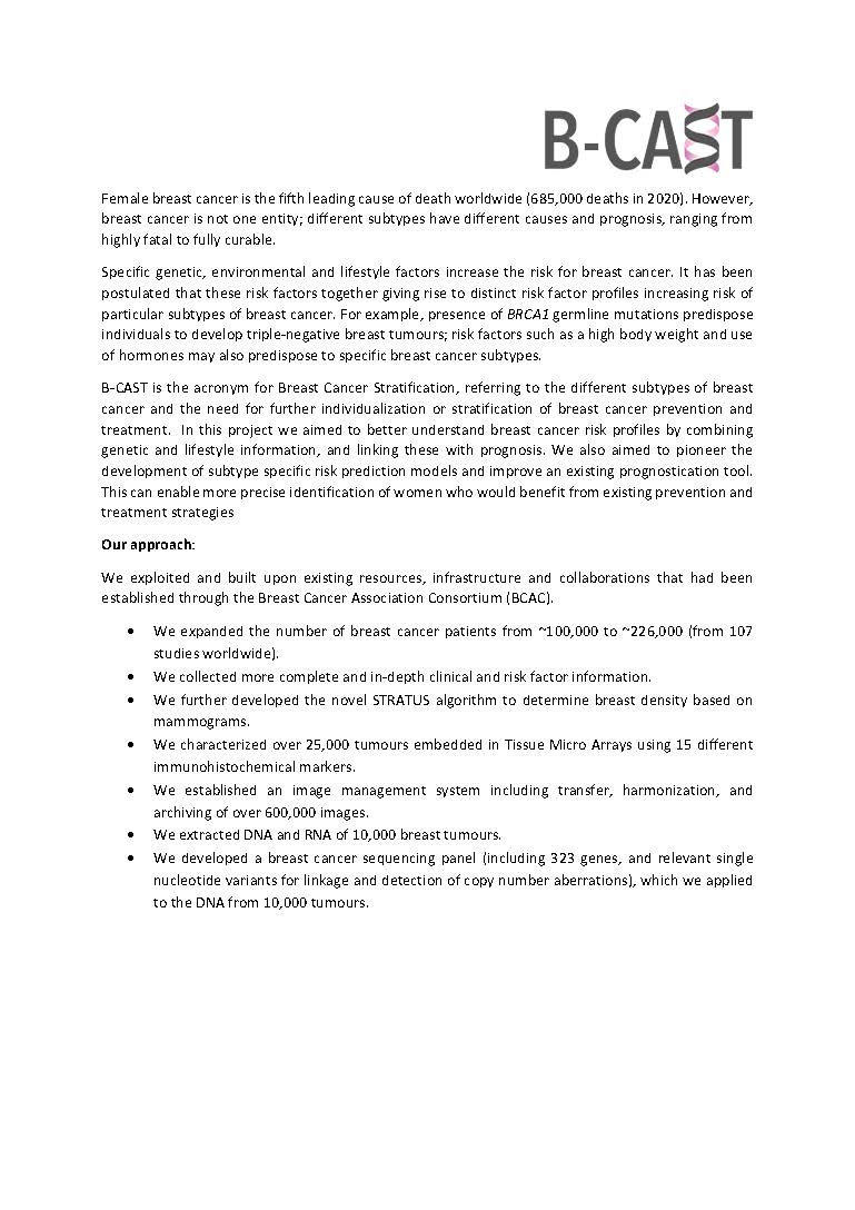 B-CAST is the acronym for Breast Cancer Stratification, referring to the different subtypes of breast cancer and the need for further individualization or stratification of breast cancer prevention and treatment. In this project we aimed to better understand breast cancer risk profiles by combining genetic and lifestyle information, and linking these with prognosis. We also aimed to pioneer the development of subtype specific risk prediction models and improve an existing prognostication tool. This can enable more precise identification of women who would benefit from existing prevention and treatment strategies