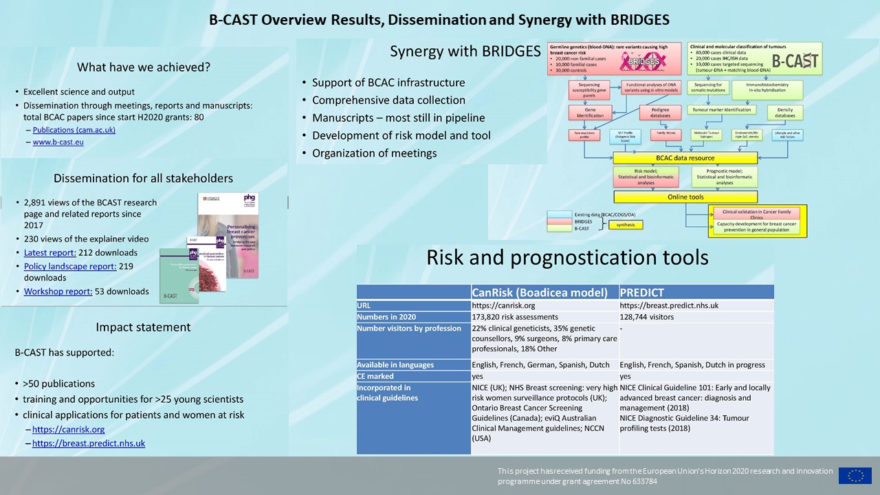 The research findings in B-CAST progressed the field of the aetiology - understanding the risk factors and mechanisms – of breast cancer risk and prognosis. The added value of two complimentary projects like B-CAST and BRIDGES funded together, was shown through the successful development of the CanRisk tool, combining the different components of both projects while striving for the same end goal.