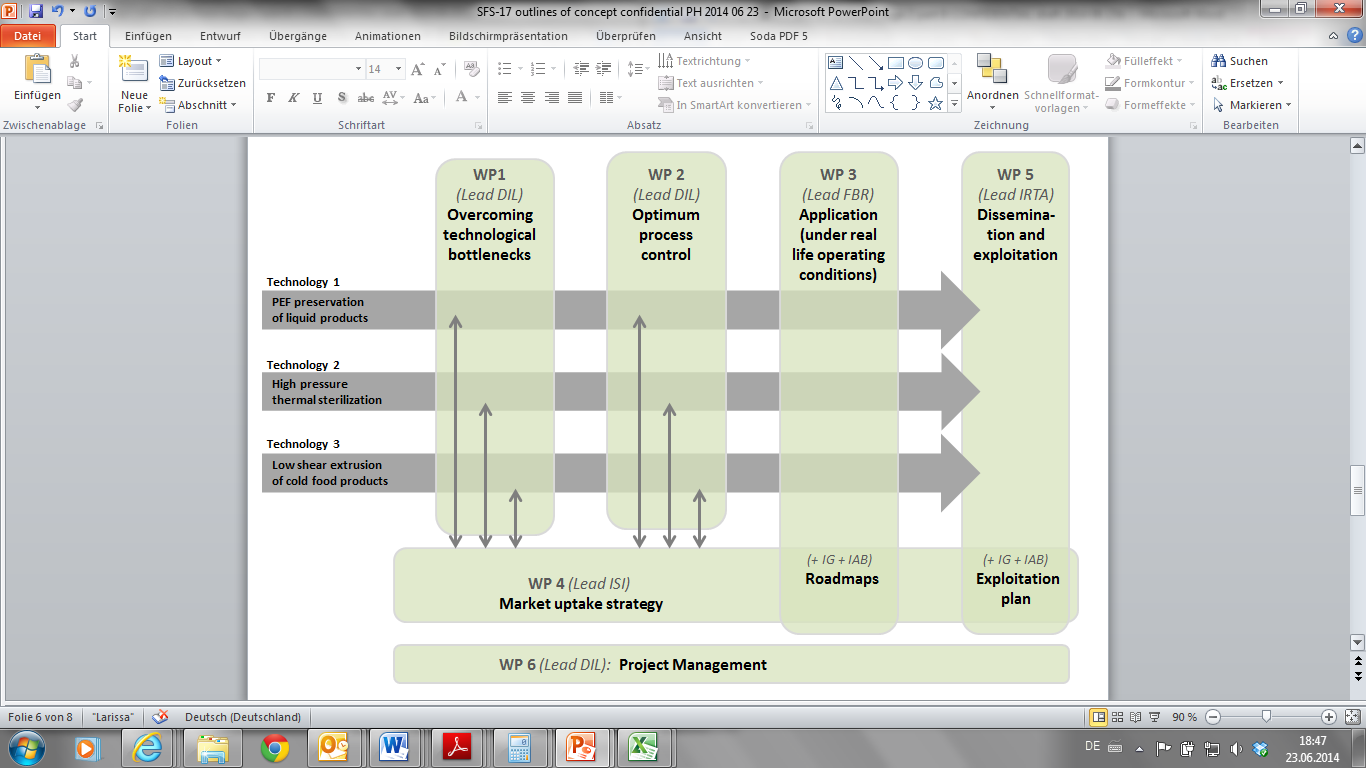 A congeneric set of both technical (online sensors) and process conditioned bottlenecks (HACCP concept) does exist which hinders their uptake by industry and in the market. Therefore, optimum process control will be achieved leading to application under real life operating conditions by demonstrating and piloting in a near to operational environment of applicable validation systems. 6 well selected industry partners strongly support the approach and contribute as technology provider or technology applicant. A scientific and cutting edge strategy for overcoming the market barriers ensuring rapid and maximum market uptake will be defined. This integrated approach will provide maximal synergies in between the 3 technologies. Application opportunities beyond the known use cases will be explored. A clear description of possible applications and potential benefits will serve as an excellent basis for the dissemination activities. Project partners of i³-food have outstanding expertise in the field of PEF, high pressure and extrusion application as well as high competences in system and innovation research.