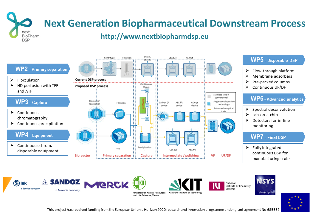 In specific work packages we focused on primary separation, where the removal of cells from product takes place. There the aim was substitution of the standard process for primary separation with the utilization of flocculants in combination with filtration or for fully continuous bioprocess (perfusion process) also implementation of tangential flow filtration (TFF). This resulted in substantial reduction of cost and in robust process for removal of cells from the product. In capture step development studies, we focused on continuous chromatography on protein A resin, where the main aim was reduction in size of the columns and reduction of need for expensive resin volume and highly improved productivity. For implementation of such process on manufacturing scale also single use continuous chromatography equipment was developed. Additionally non-chromatographic capture step alternatives, such as continuous precipitation, were explored as a future approaches for purification of biopharmaceuticals. Single-use disposable technology for all downstream processing operations was evaluated and flow-through approaches for polishing steps implemented, to remove impurities in a continuous way. Other options for processing of biopharmaceuticals in a continuous way were also implemented, such as continuous virus inactivation and different continuous UF/DF techniques as part of continuous final DS formulation approach. Best performing technologies were selected and implemented on large scale continuous and integrated process, where we achieved reduction in the size and number of downstream unit operations. In order to monitor and control the established process, advanced analytical tools for measuring impurities, product content and other parameters in real time or close to real time were implemented.