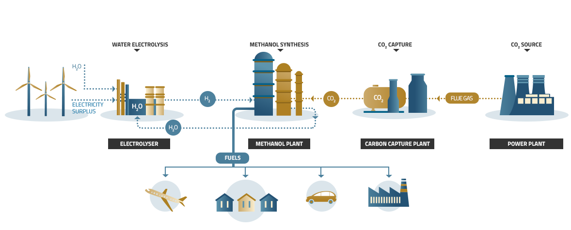Concept: ordinarily emitted CO2 and H2 produced from surplus renewable electricity into methanol. Technology designed in a modular intermediate-scale, able to adapt it to varying plant sizes and gas composition.
