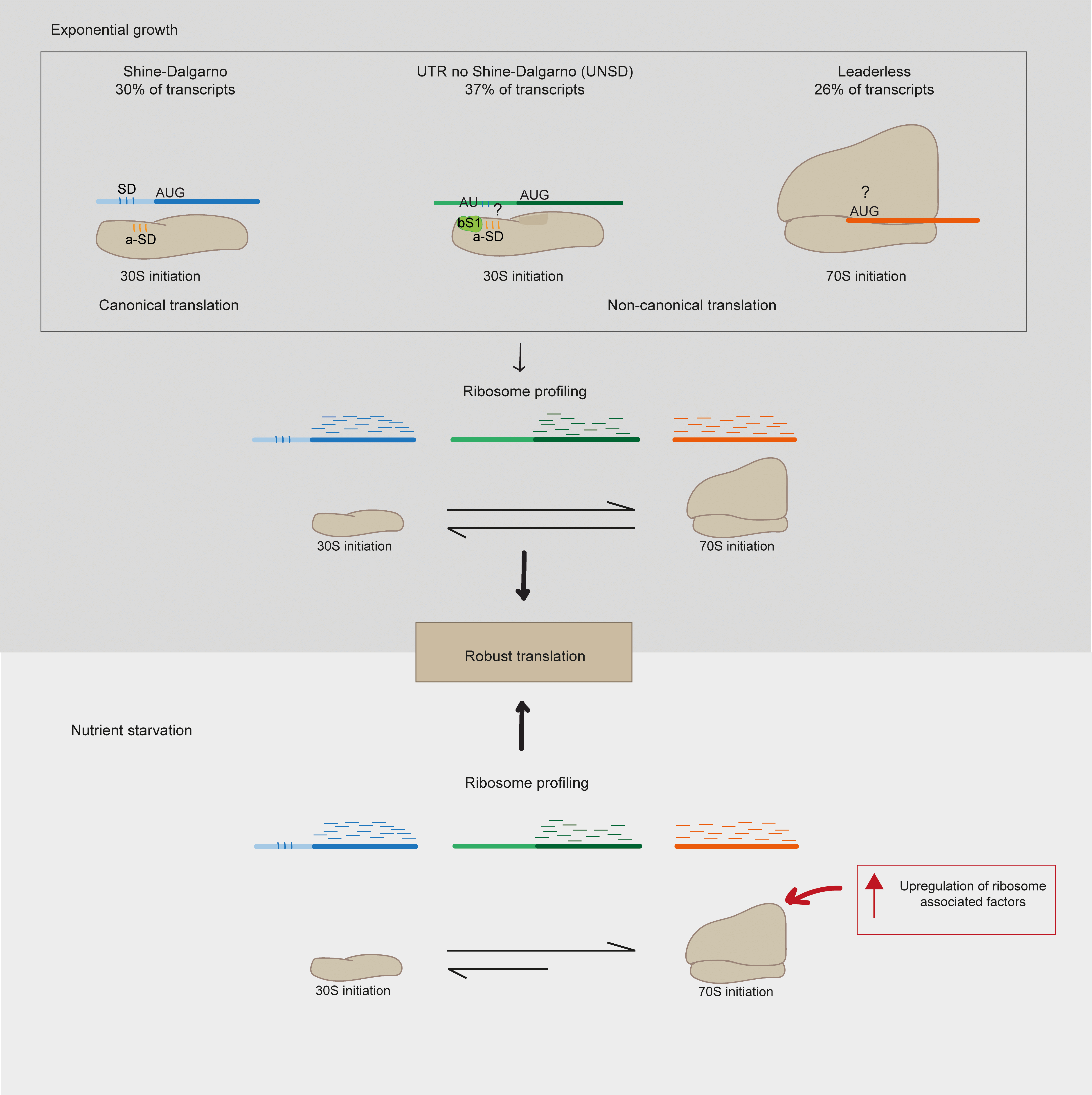 Translation, the process by which the sequence of nucleotides in a gene directs the synthesis of proteins, is an intricate process involving many cellular components. The ribosome has been traditionally considered as a conserved nucleoprotein with the only role of mediating this process. Genes contain specific signals that optimise their interaction with ribosomes, known as leader sequences, these include the Shine-Dalgarno (SD) sequence required for canonical translation initiation in bacteria. There is recent evidence that suggests that ‘specialised ribosomes’, which are modified ribosomal particles, can modify the proteome profile by preferential translation of particular gene subsets, particularly in response to stress. M. tuberculosis differs from other important human pathogens in expressing a large number of leaderless genes, which do not have the SD sequence required for canonical translation initiation. In the model bacteria Escherichia coli, only a few leaderless genes have been described, and they are selectively translated by specialised ribosomes upon stress conditions. We have previously shown in M. tuberculosis that under conditions of nutrient starvation, the abundance of leaderless genes increases, suggesting that translation of leaderless genes may be an important component of the adaptive response of this pathogen.