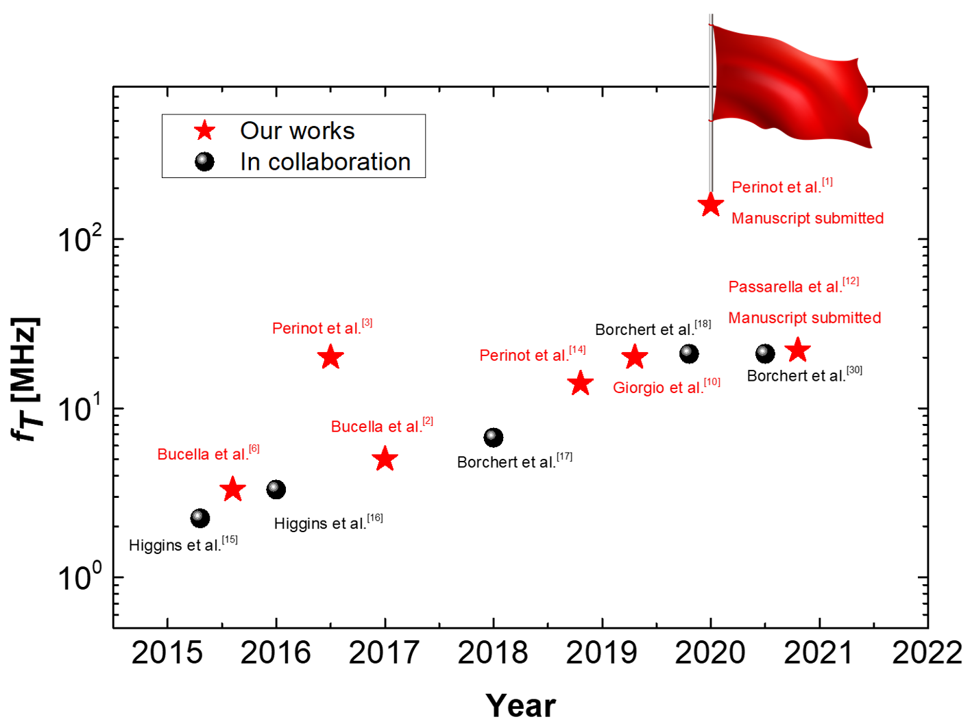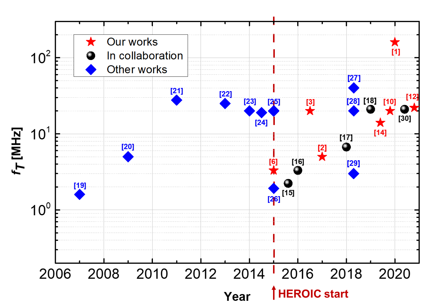 Figure 2 summarizes the measured fT of organic transistors from selected international works achieving the best results (blue symbols),[19-30] comprising all technologies, including devices with lithography patterned electrodes and evaporated semiconductors. After a first fast increase in fT from 2007 to 2011, when 27.7 MHz were achieved with a device based on an evaporated small molecule and a channel length of 2 μm defined by photolithography. Then a sort of plateau is present up to 2018. HEROIC started in 2015, targeting high-frequency with transistors based on printed semiconductors, fabricated without the use of any processing mask and by combining only low-temperature, printing and direct-writing processes. With a fast improvement, HEROIC reached fT values achieved with other technologies, and then surpassed them setting the new absolute record for organic transistors at 160 MHz.