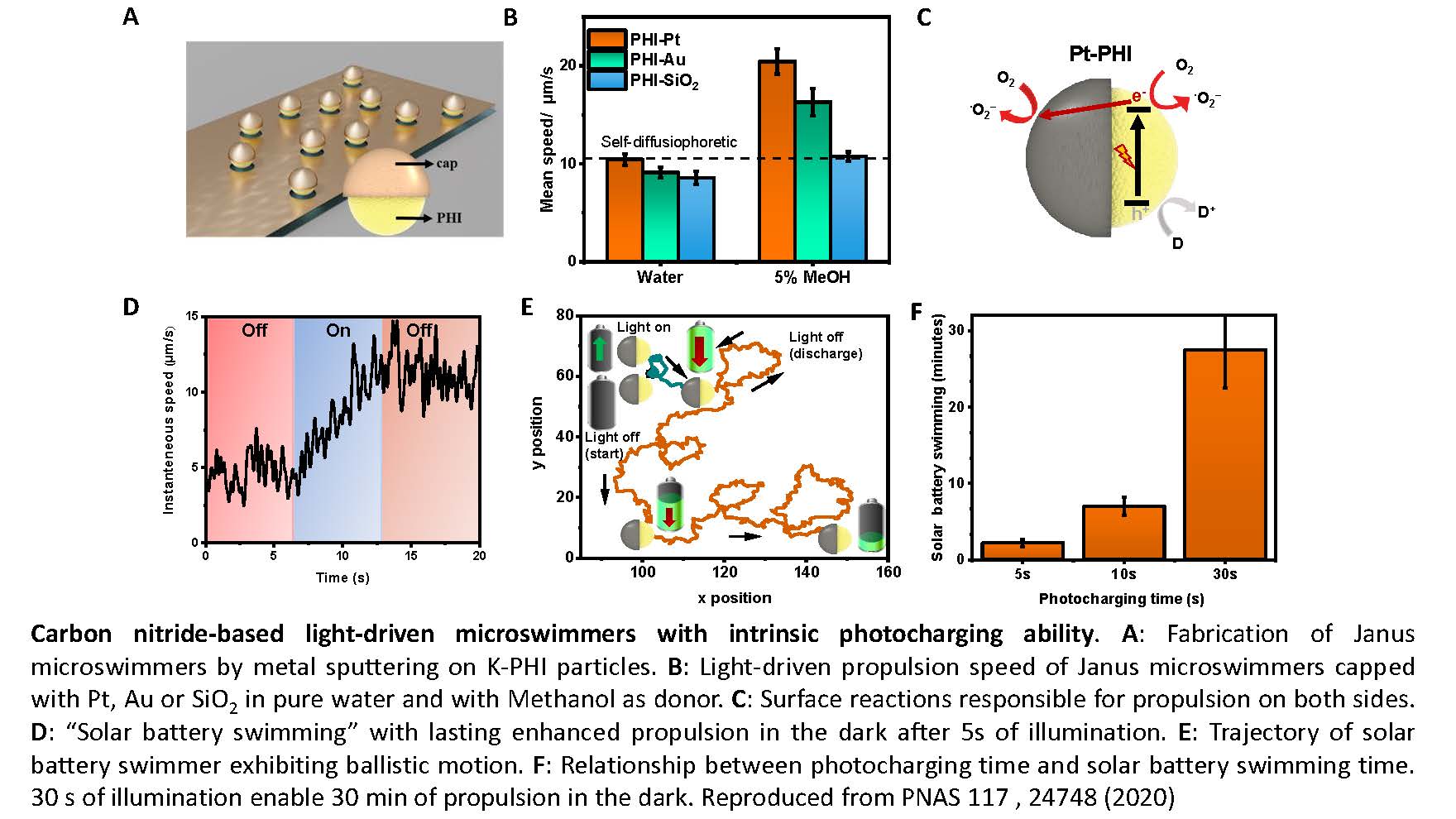 The unusual charge-storage capability of PHI has been used to create a solar battery photoanode (Adv. Mater. 30, 1705477 (2018)). Besides, we have developed photocapacitive PHI microswimmers, which can be charged by solar energy enabling light-induced propulsion even in the dark (PNAS 117, 24748 (2020)). This mechanism significantly extends the capabilities of micromachines in targeted drug delivery and environmental remediation.